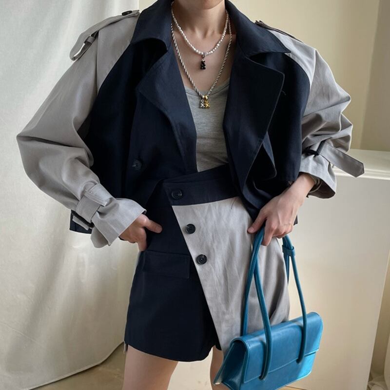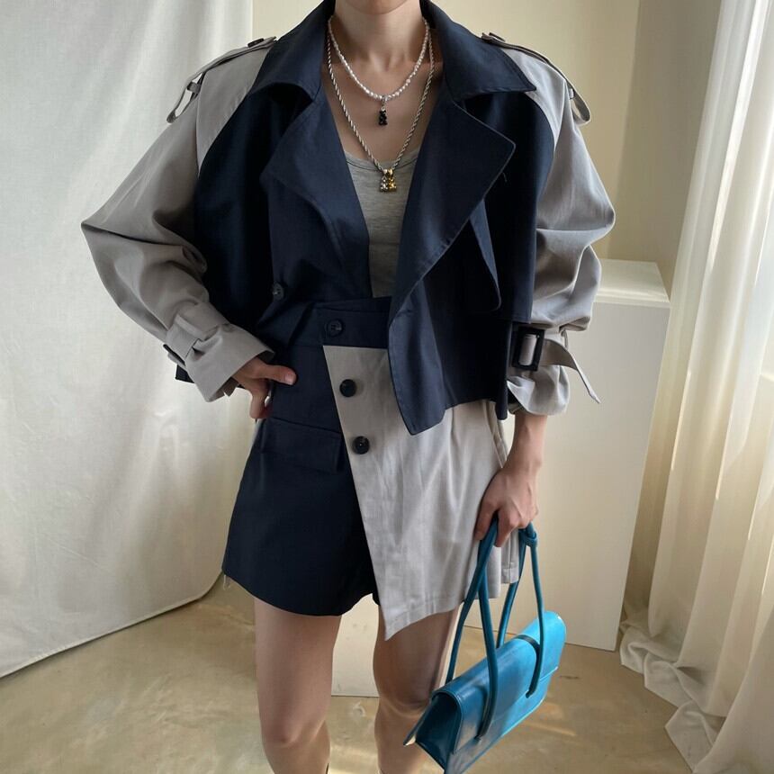 色:カーキ色のコート,ロイヤルブルーコート,カーキショートパンツ,ロイヤルブルーショーツ,ホワイトT