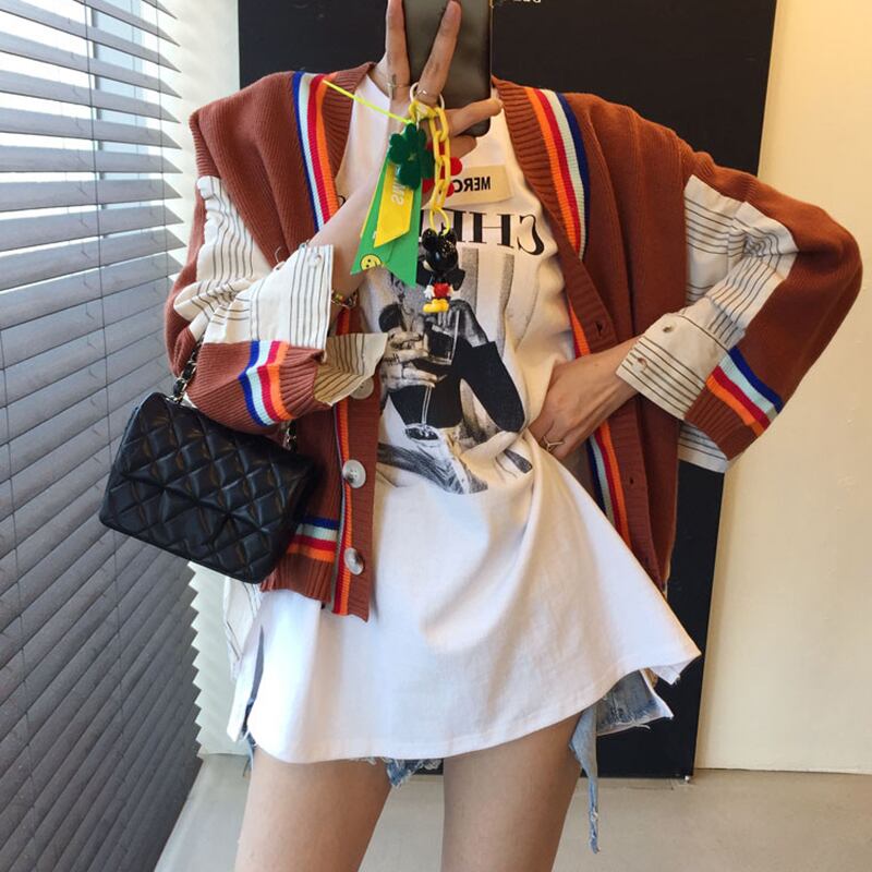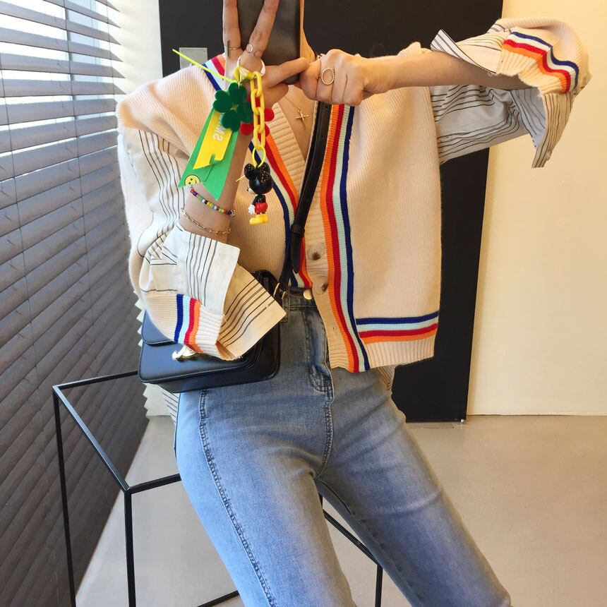 【韓国ファッション】大人可愛い オータムスタイルVネックストライプシャツ カラーニットカーディガンセーター 秋物 ステッチ ♡ 韓国33445508193 | パリジェンヌ、韓国系ファッション July