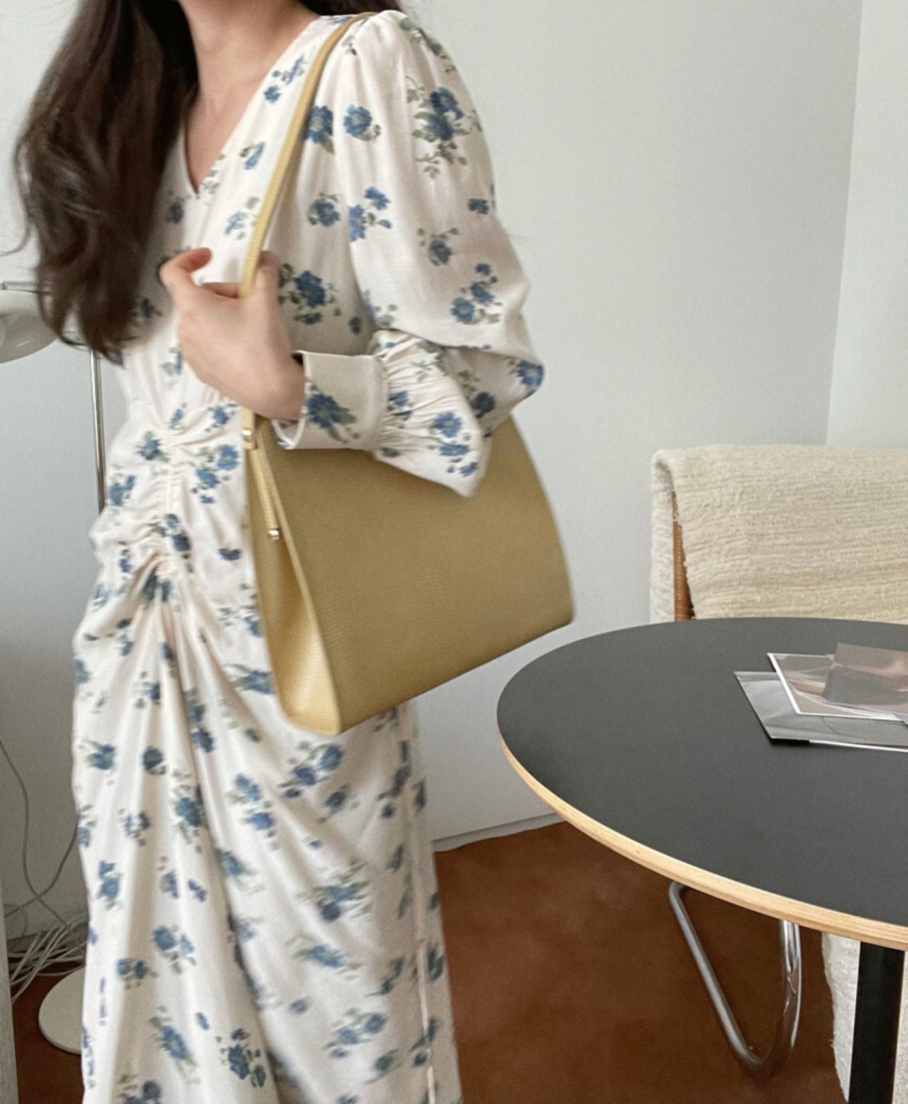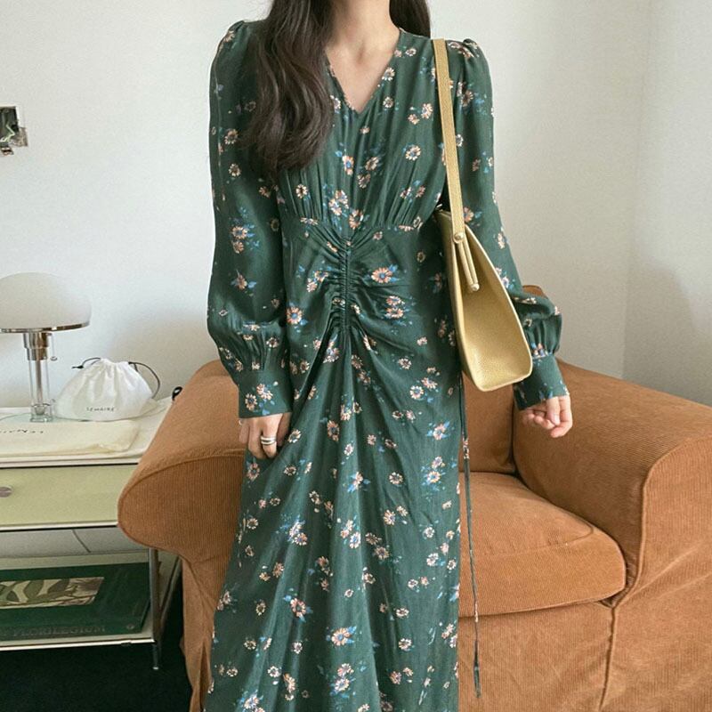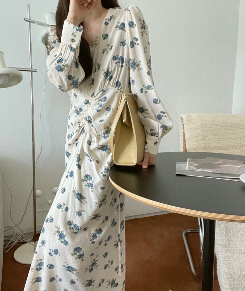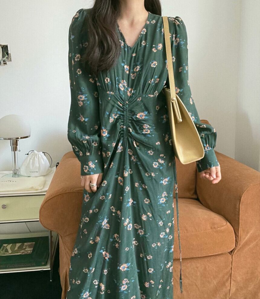 【韓国ファッション】大人可愛い オータムスタンダード薄手Vネックスリムハイウェストウェストスリーブフローラルドレス レトロ 秋物 花柄 ♡ 韓国36547549441 | パリジェンヌ、韓国系ファッション July