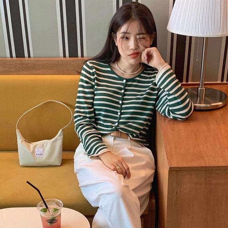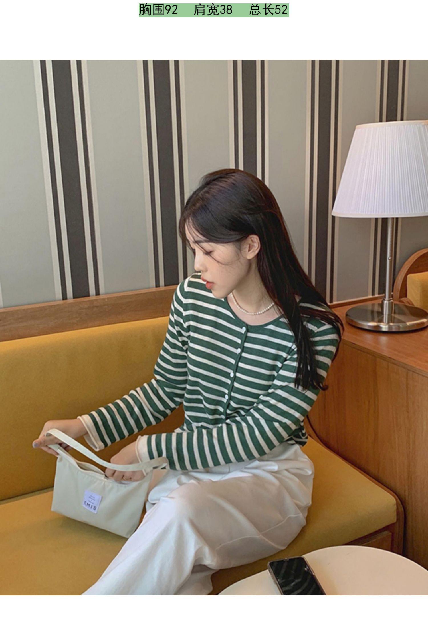 韓国服 スタンダードグリーンストライプニットカーディガンオータム薄手コート ラウンドネックトップス ロング レトロ 秋物 Oネック ♡ nanfeng29587334011 | パリジェンヌ、韓国系ファッション July