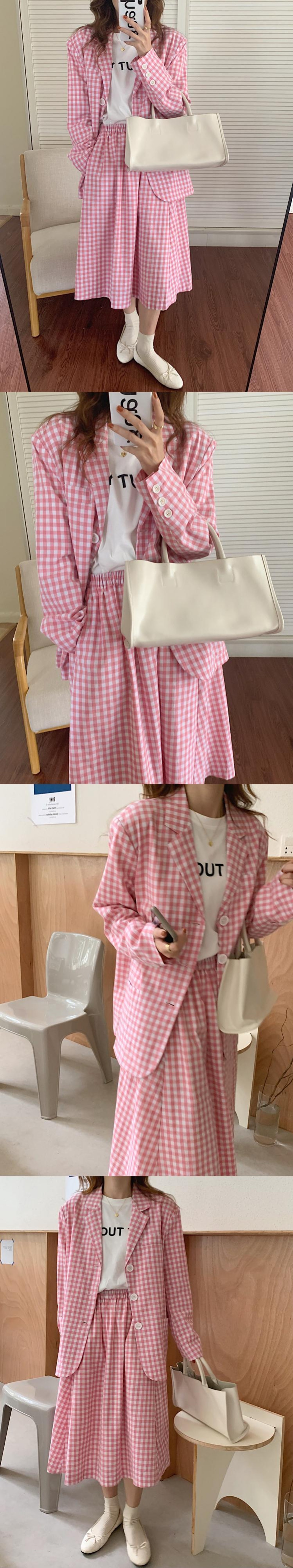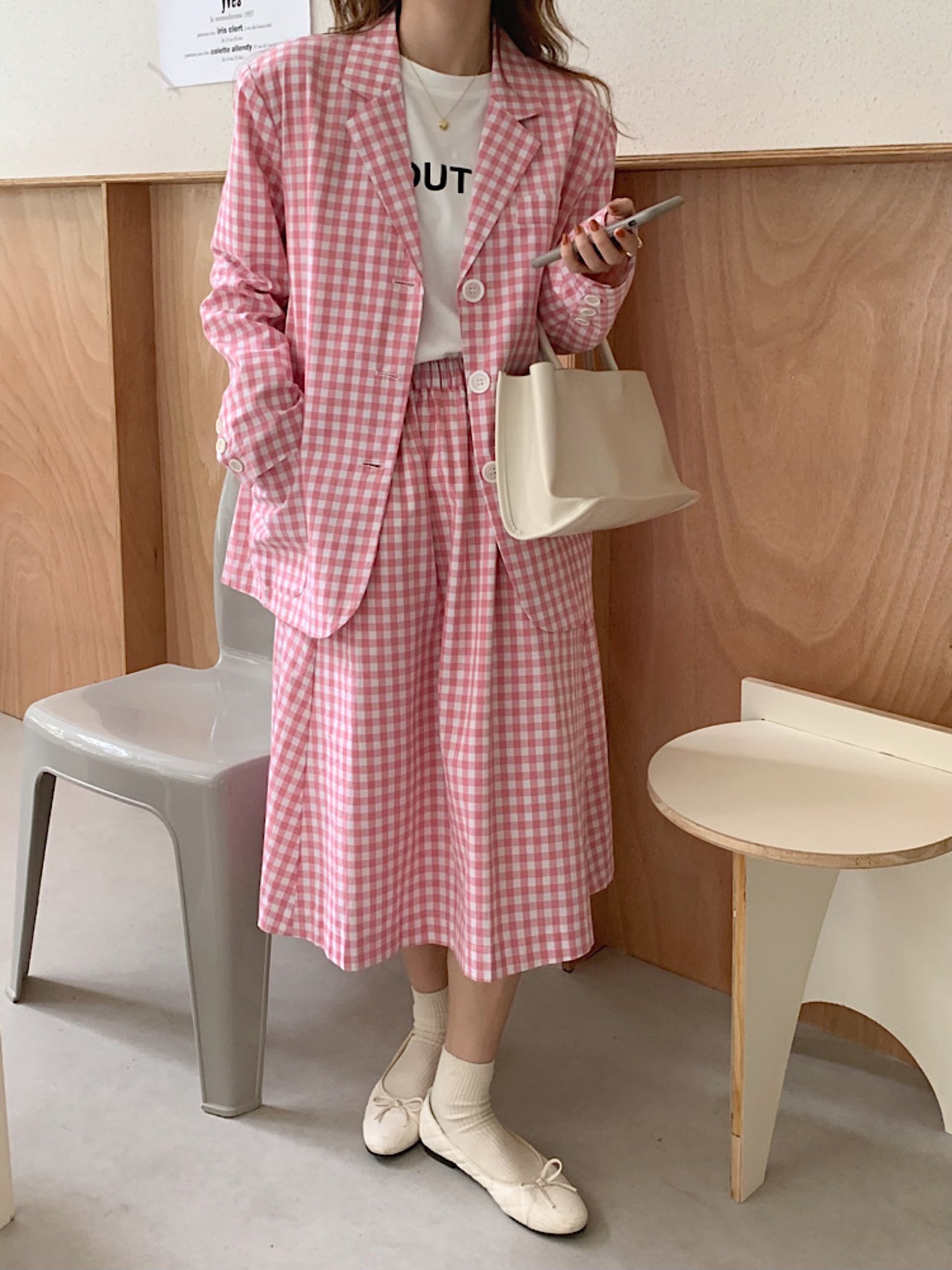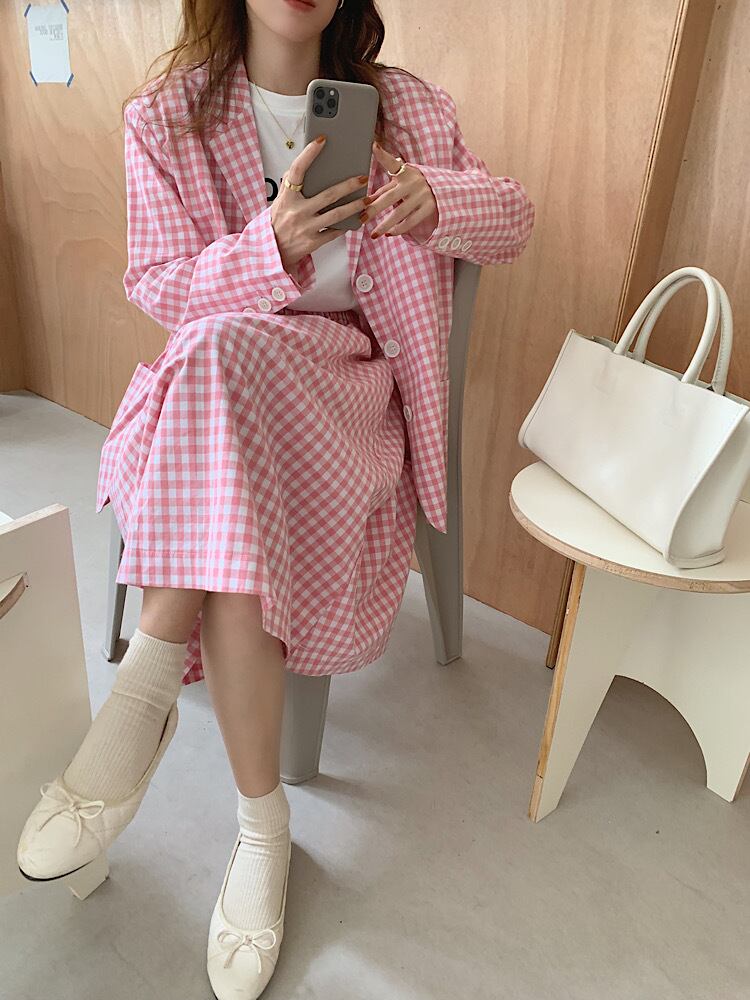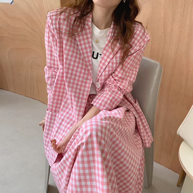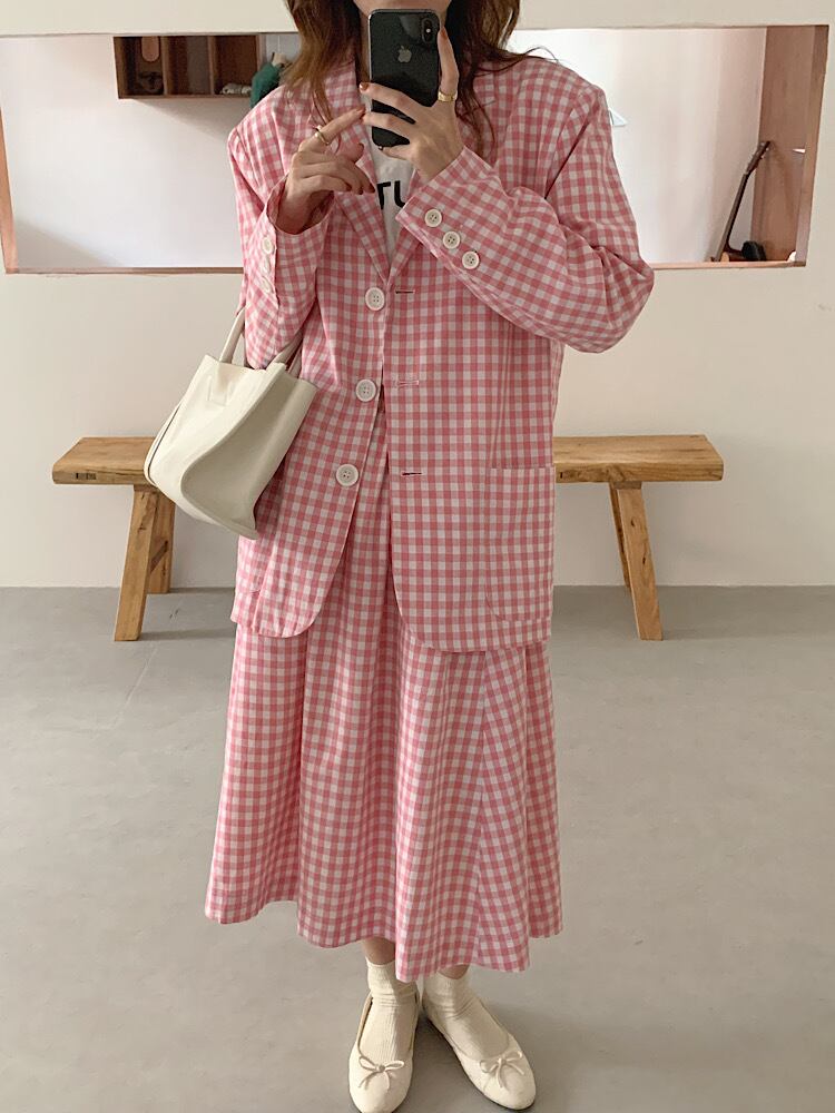 【韓国ファッション】大人可愛い オータム格子柄ルーズジャケット ハイウェストウェストAラインスカート ロング ピンク 秋物 ♡ 韓国21930144572 | パリジェンヌ、韓国系ファッション July