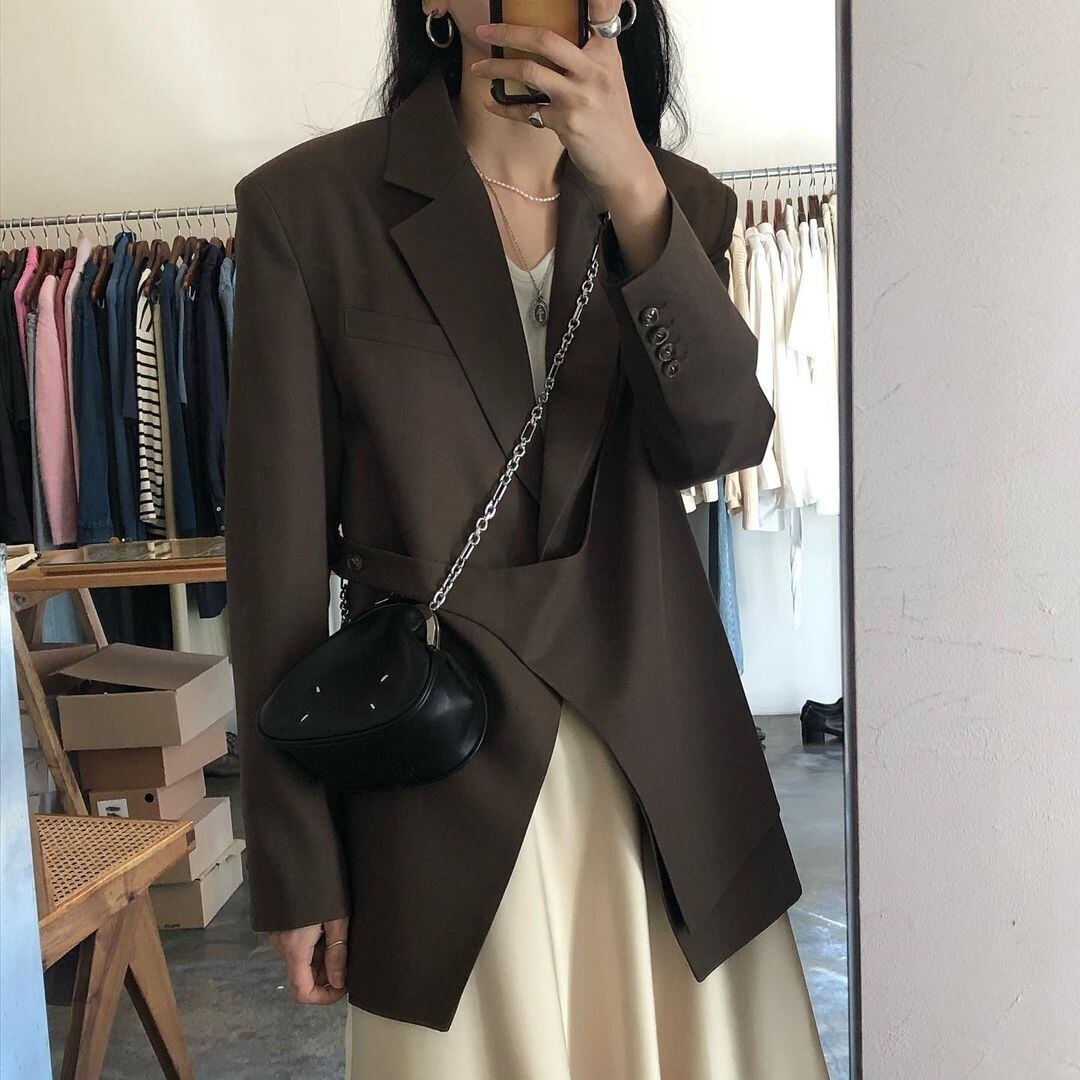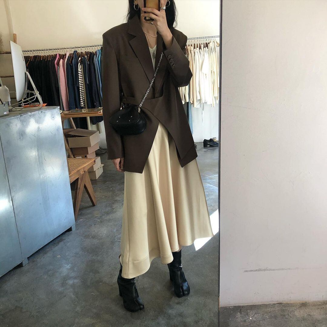 色:青いスカート,黄色のスカート,茶色のスーツ,ダークグレーのスーツ