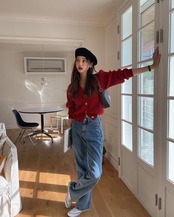 【韓国ファッション】大人可愛い オータムスタンダード薄手Vネックストライプルーズスリーブニットカーディガンセーター ランタンスリーブ レトロ 秋物 ♡ 韓国47879716214 | パリジェンヌ、韓国系ファッション July