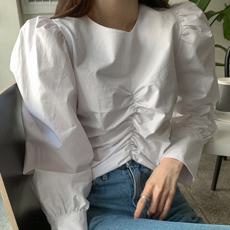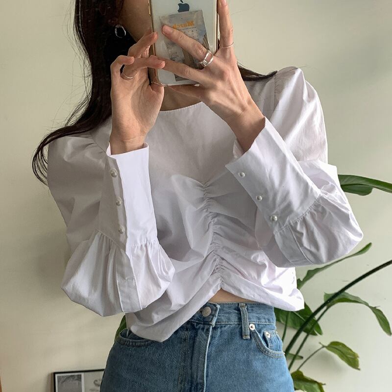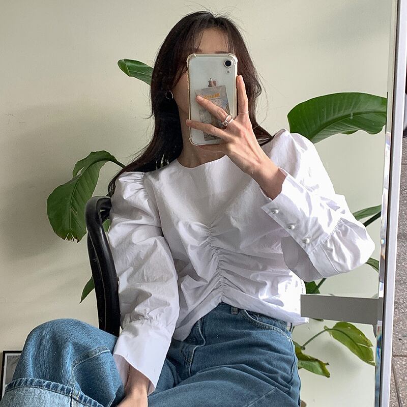 【韓国ファッション】大人可愛い ラウンドネックプリーツスリムショートパールバックルスリーブシャツ レディース Oネック 真珠 ♡ 韓国42611558315 | パリジェンヌ、韓国系ファッション July