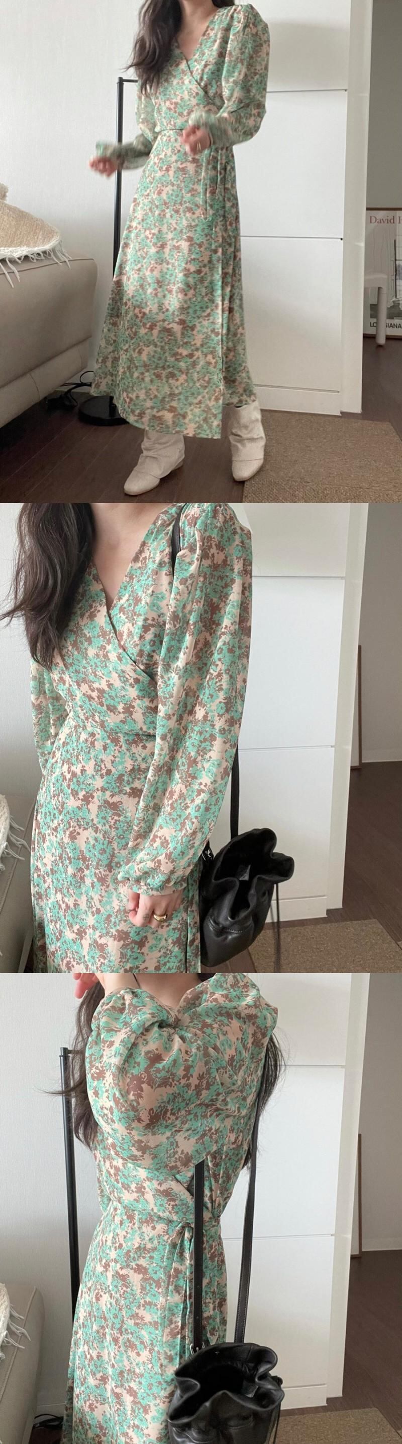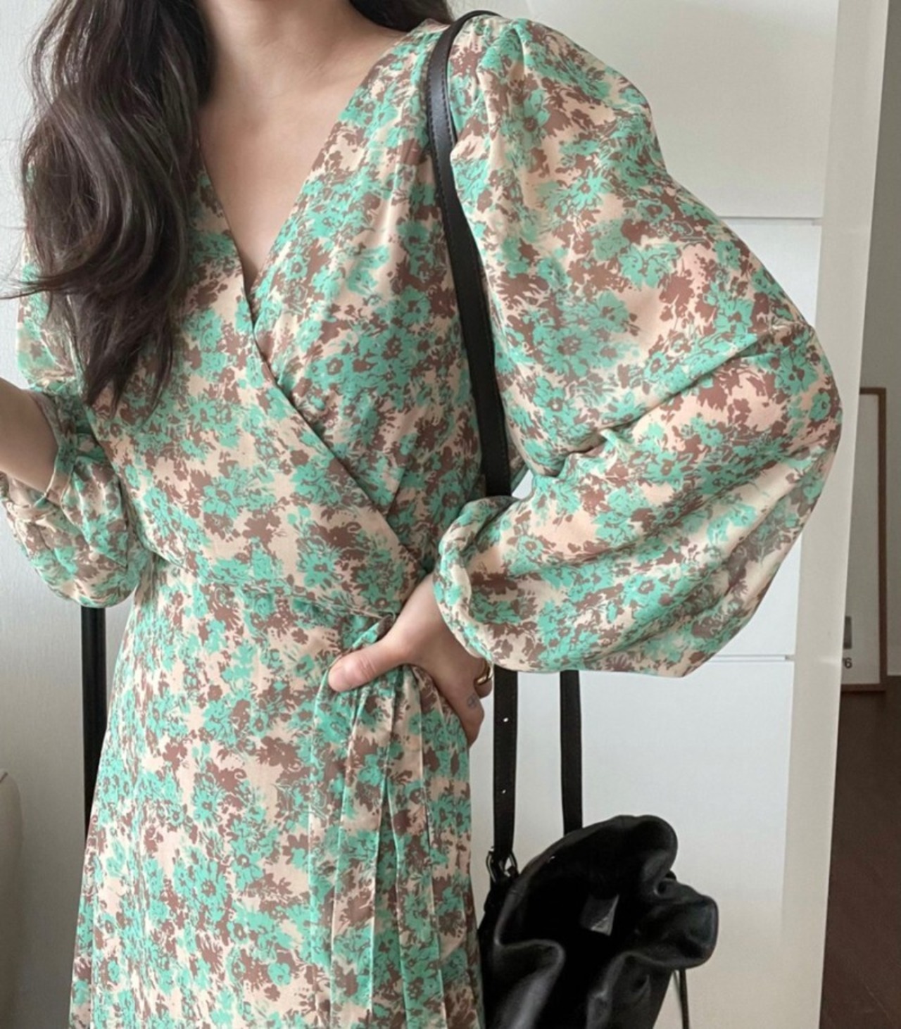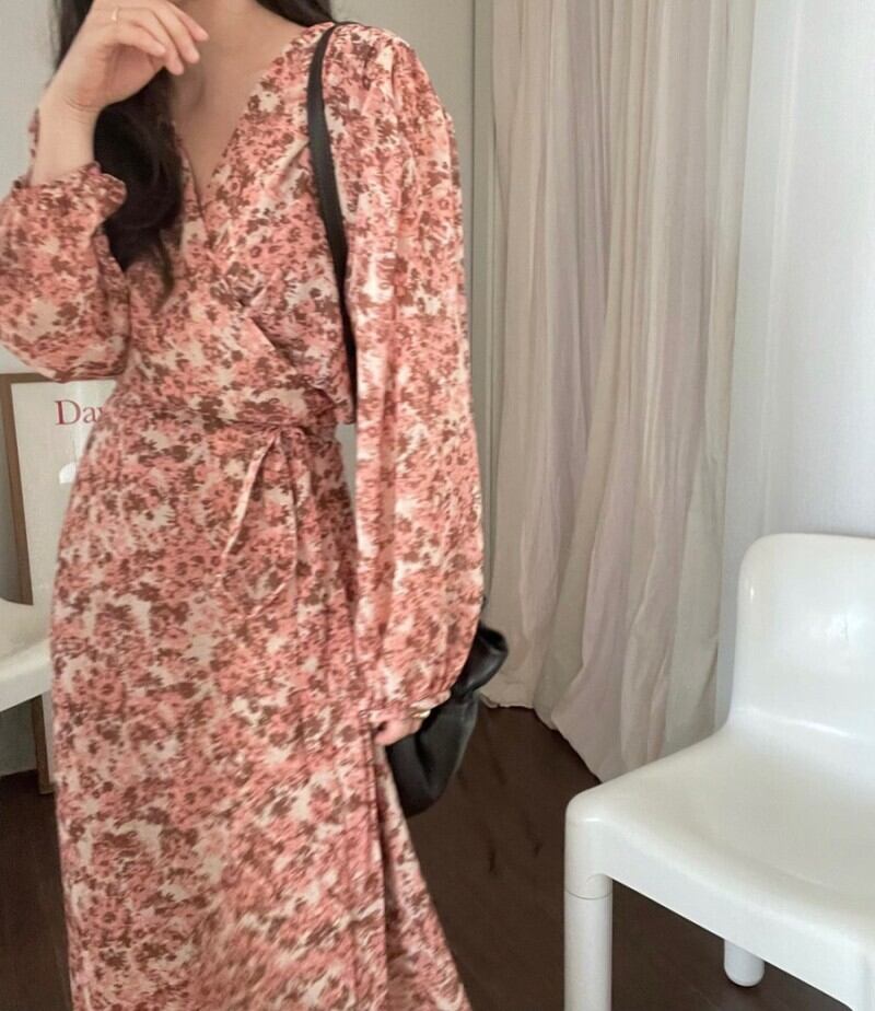 【韓国ファッション】大人可愛い オータムスタンダード薄手Vネッククロスウェストワンピースフローラルドレス ロング レトロ エレガント 秋物 花柄 ♡ 韓国98491284147 | パリジェンヌ、韓国系ファッション July
