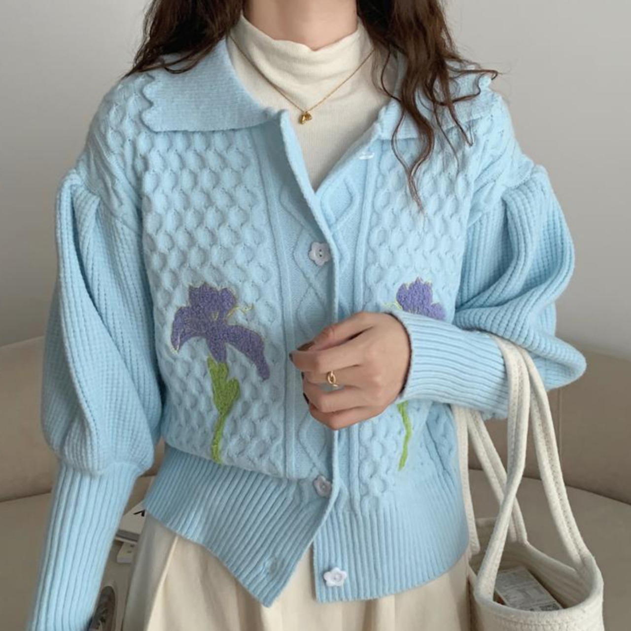 【韓国ファッション】大人可愛い ブルーFlowerデザイン ボタンスリーブニットカーディガンセーター ランタンスリーブ フラワーデザイン ♡ 韓国49243415532 | パリジェンヌ、韓国系ファッション July