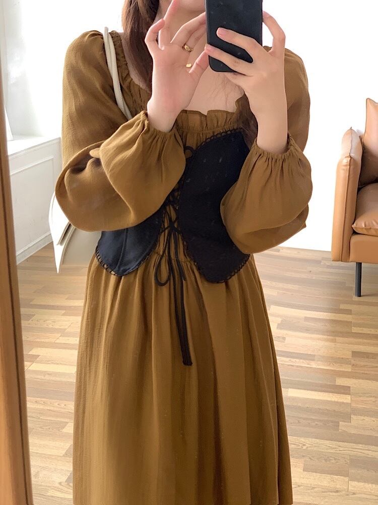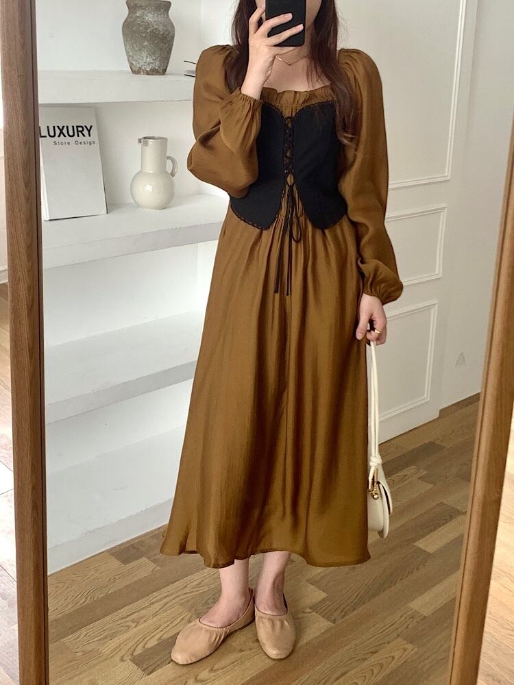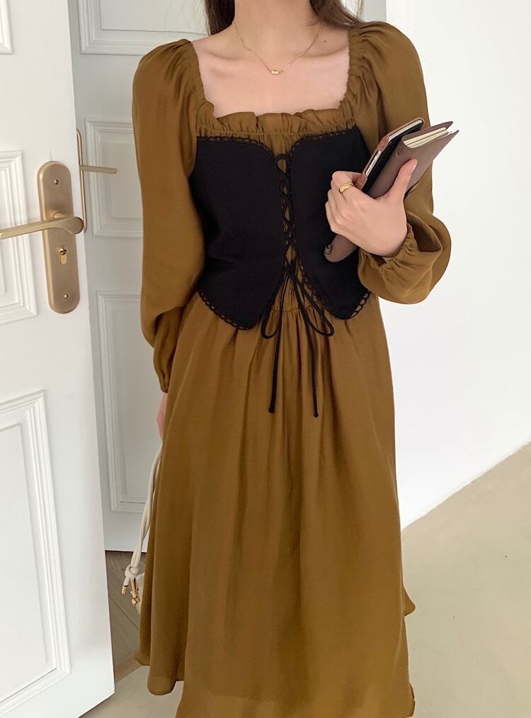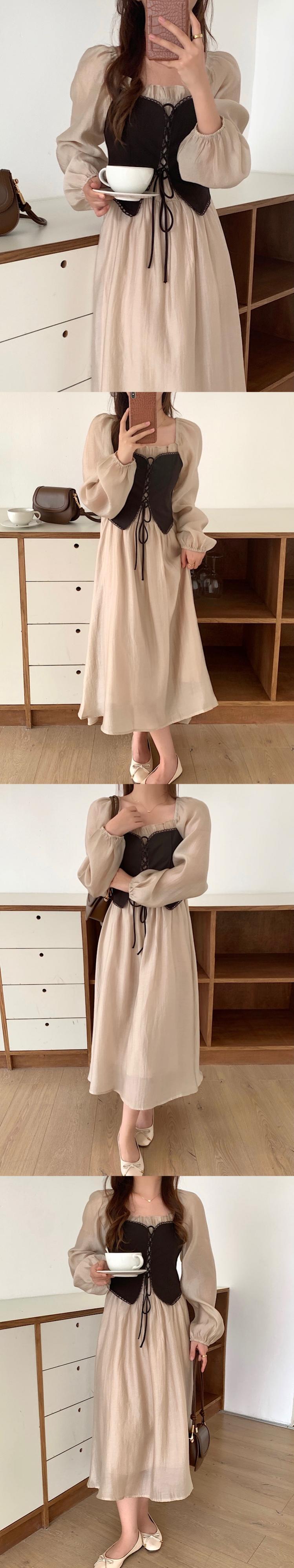 【韓国ファッション】大人可愛い スタイルツーピースプリーツウェストドレス ロング レース レースアップ スクウェア ステッチ ♡ 韓国6552632235 | パリジェンヌ、韓国系ファッション July
