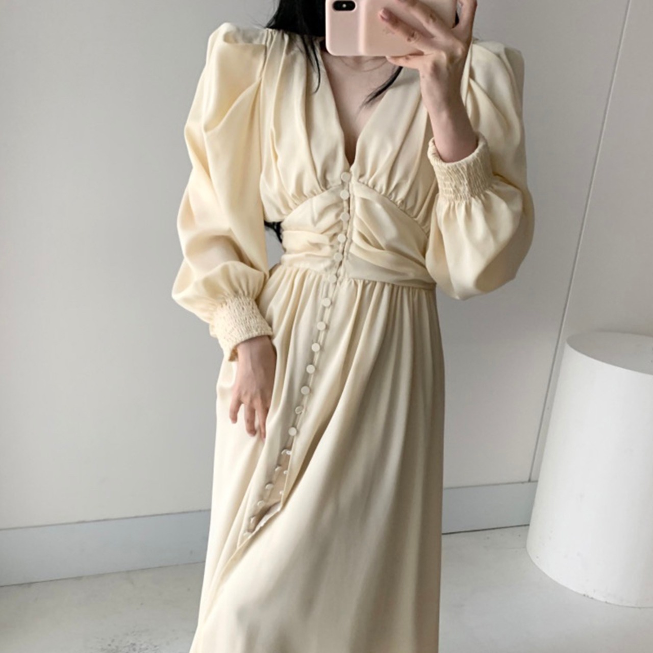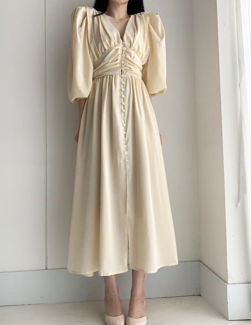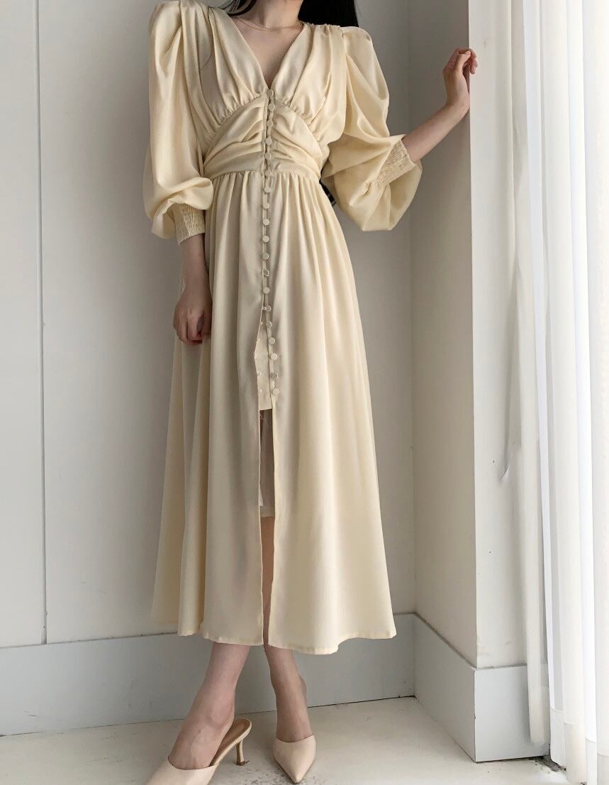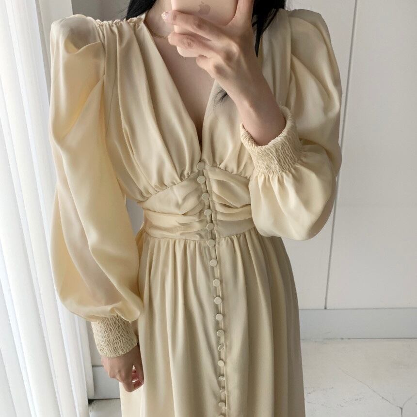 【韓国ファッション】大人可愛い 薄手Vネックブレストプリーツハイウェストウェストスリーブロングドレス レディース エレガント ♡ 韓国2977397172 | パリジェンヌ、韓国系ファッション July