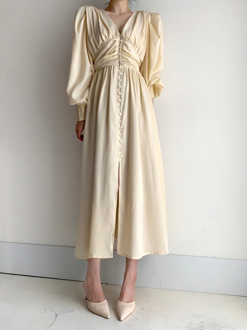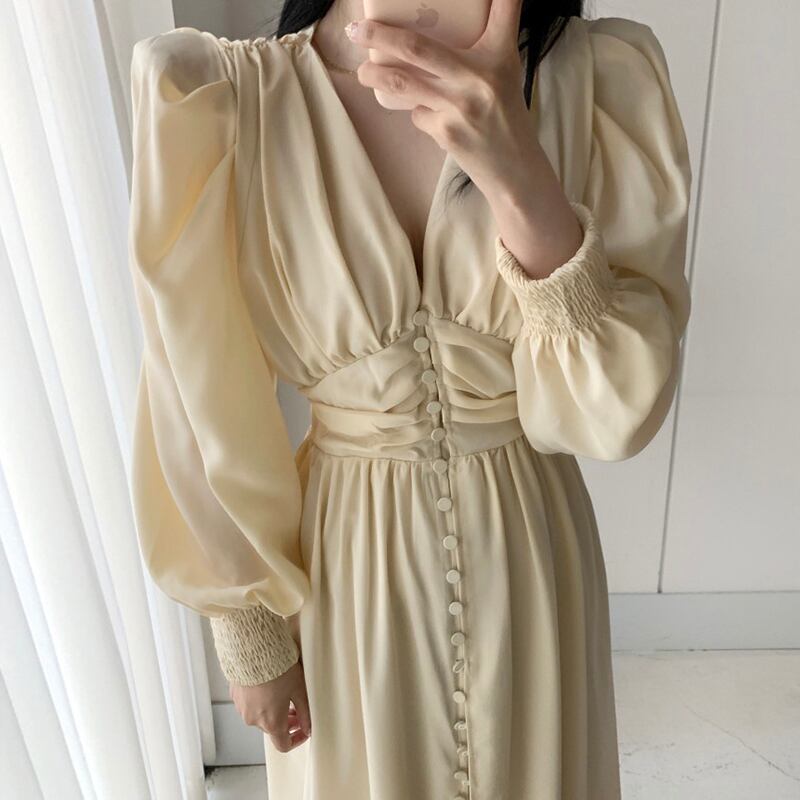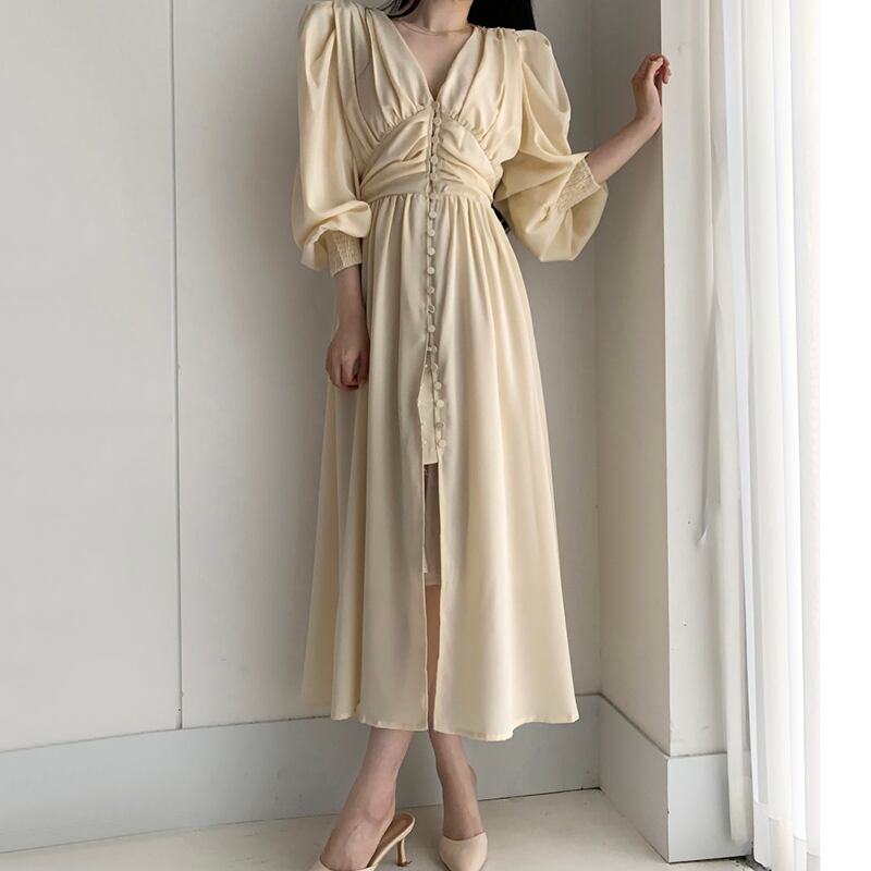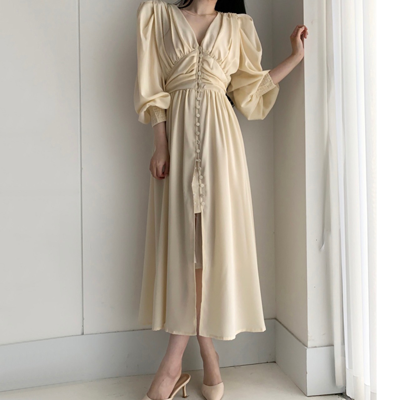 【韓国ファッション】大人可愛い 薄手Vネックブレストプリーツハイウェストウェストスリーブロングドレス レディース エレガント ♡ 韓国2977397172 | パリジェンヌ、韓国系ファッション July