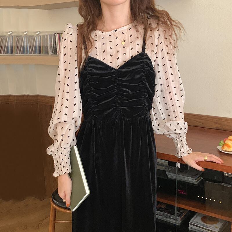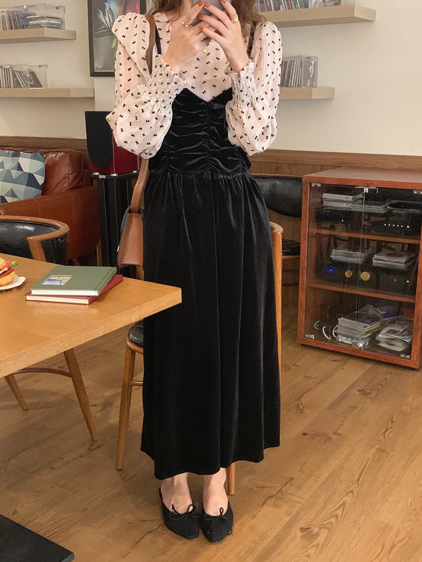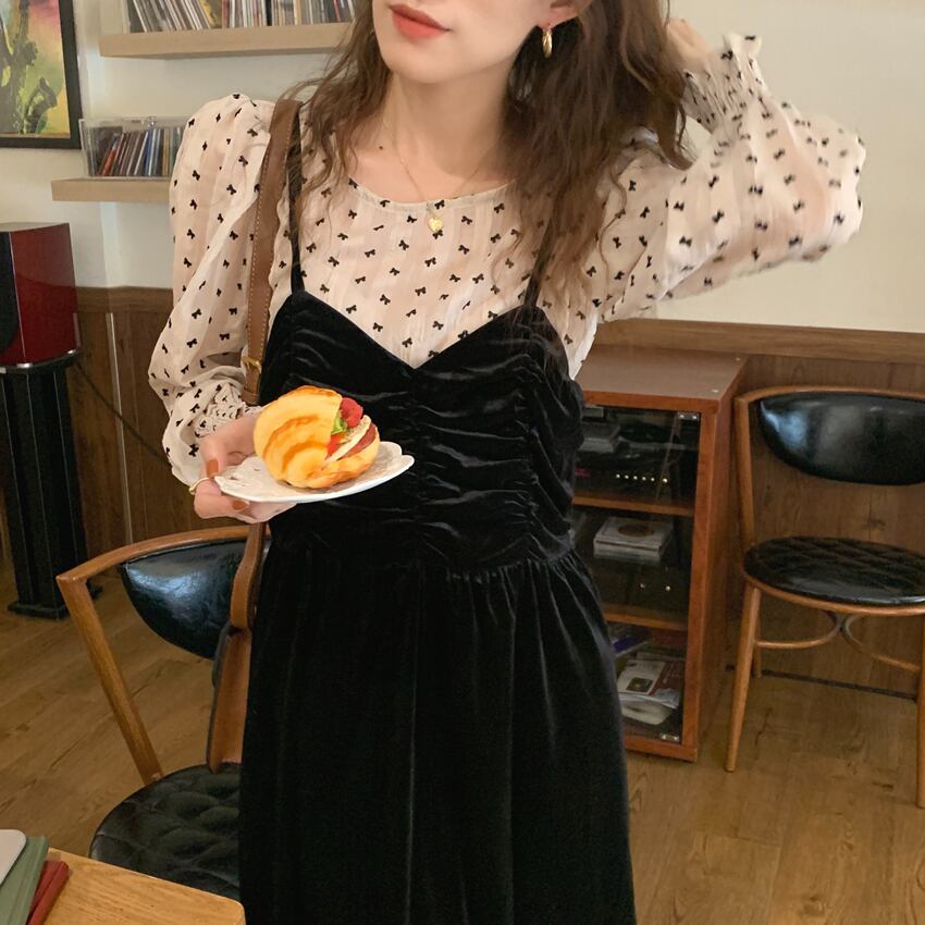 【韓国ファッション】大人可愛い ラウンドネックプリントスリーブシャツ プリーツウェストベルベットドレス リボン Oネック ♡ 韓国32853846197 | パリジェンヌ、韓国系ファッション July