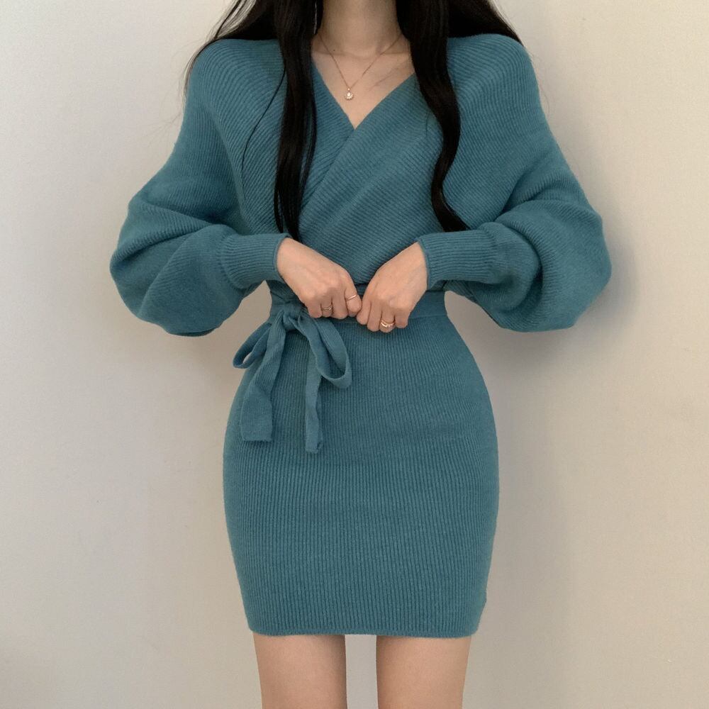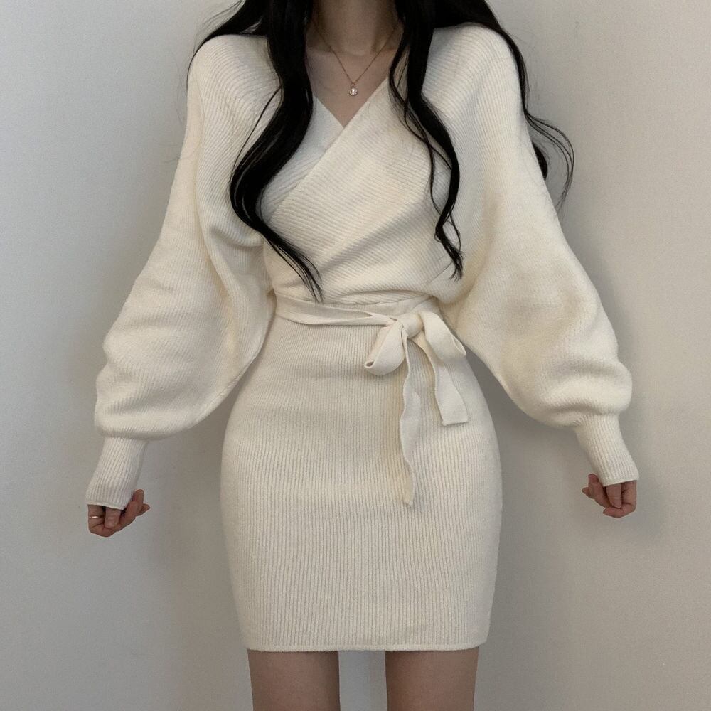 【韓国ファッション】大人可愛い オータムスタンダードクロスVネックウェストスリーブニットドレス ランタンスリーブ レトロ 秋物 ♡ 韓国909810391 | パリジェンヌ、韓国系ファッション July