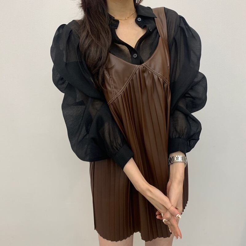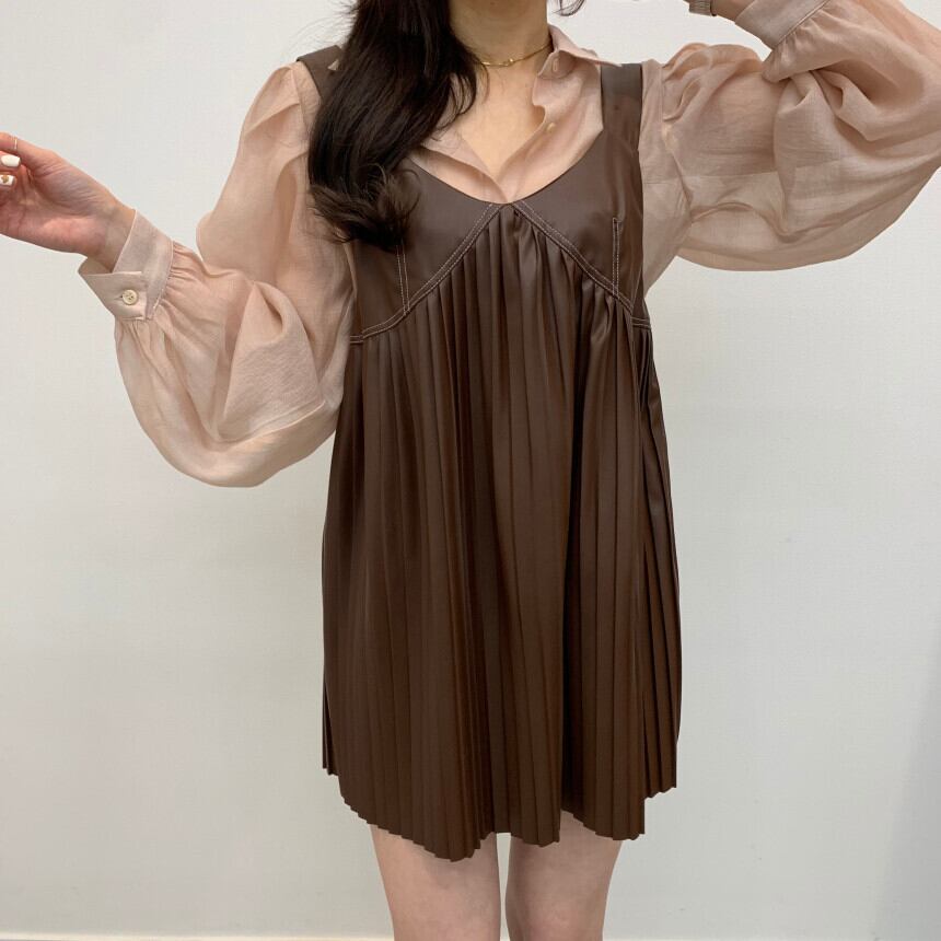 色:白のシャツ,ピンクのシャツ,黒いシャツ,ブラウンレザースカート,黒革のスカート