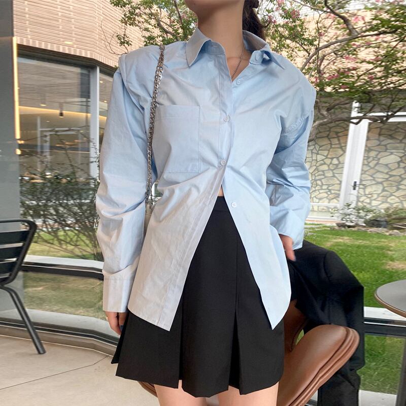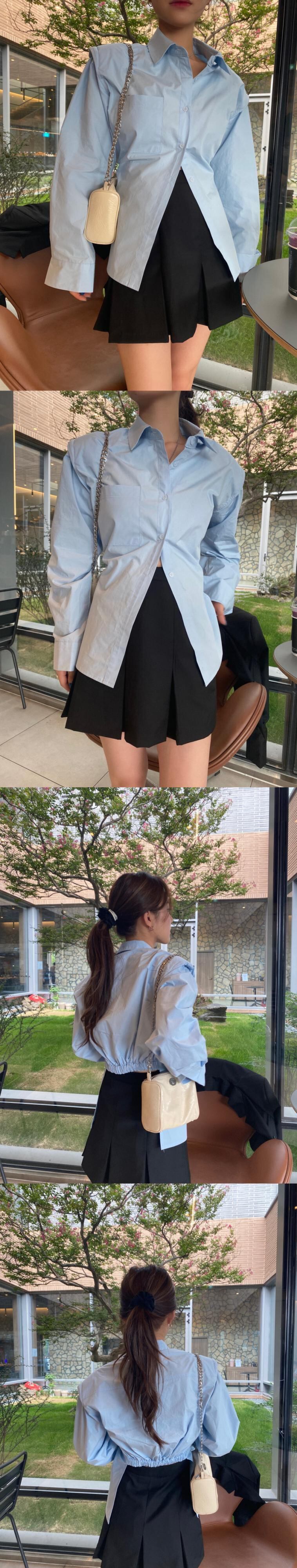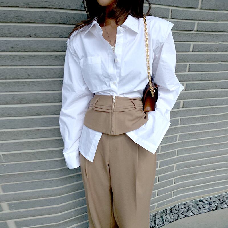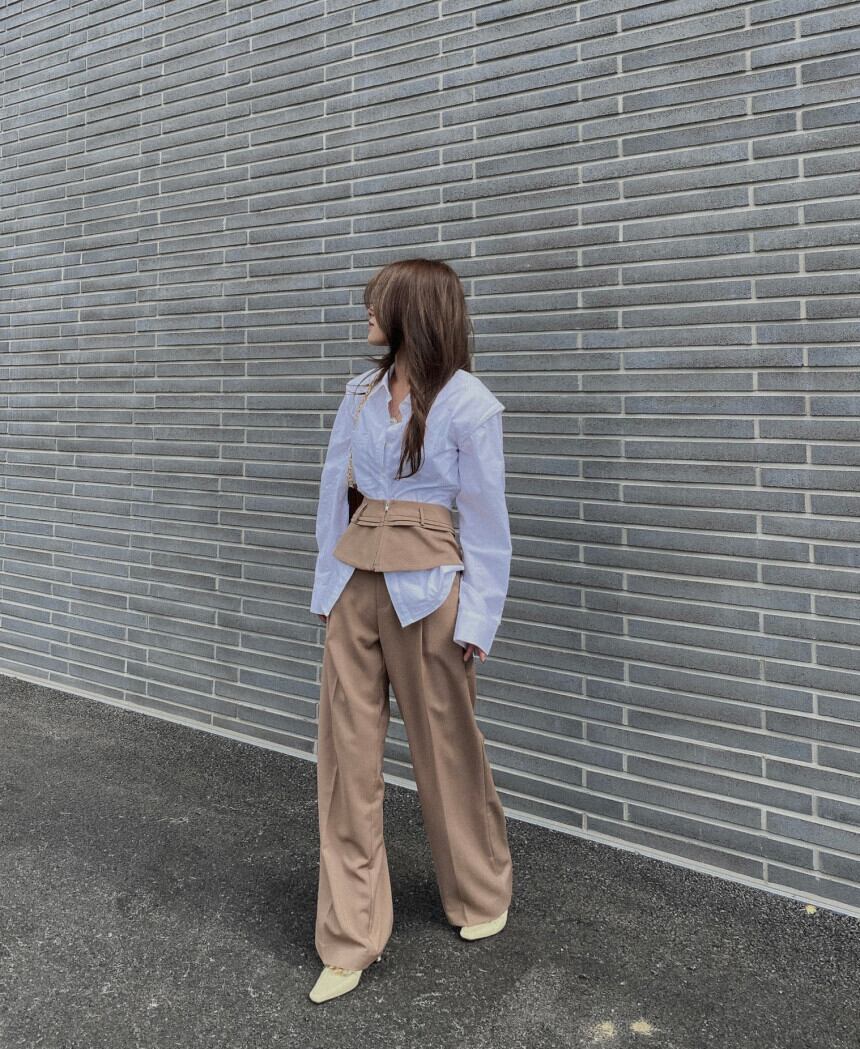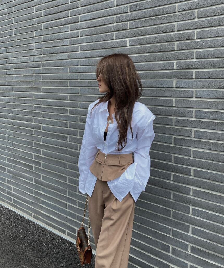 色:白のシャツ,青いシャツ,カーキガードル,カーキカジュアルパンツ