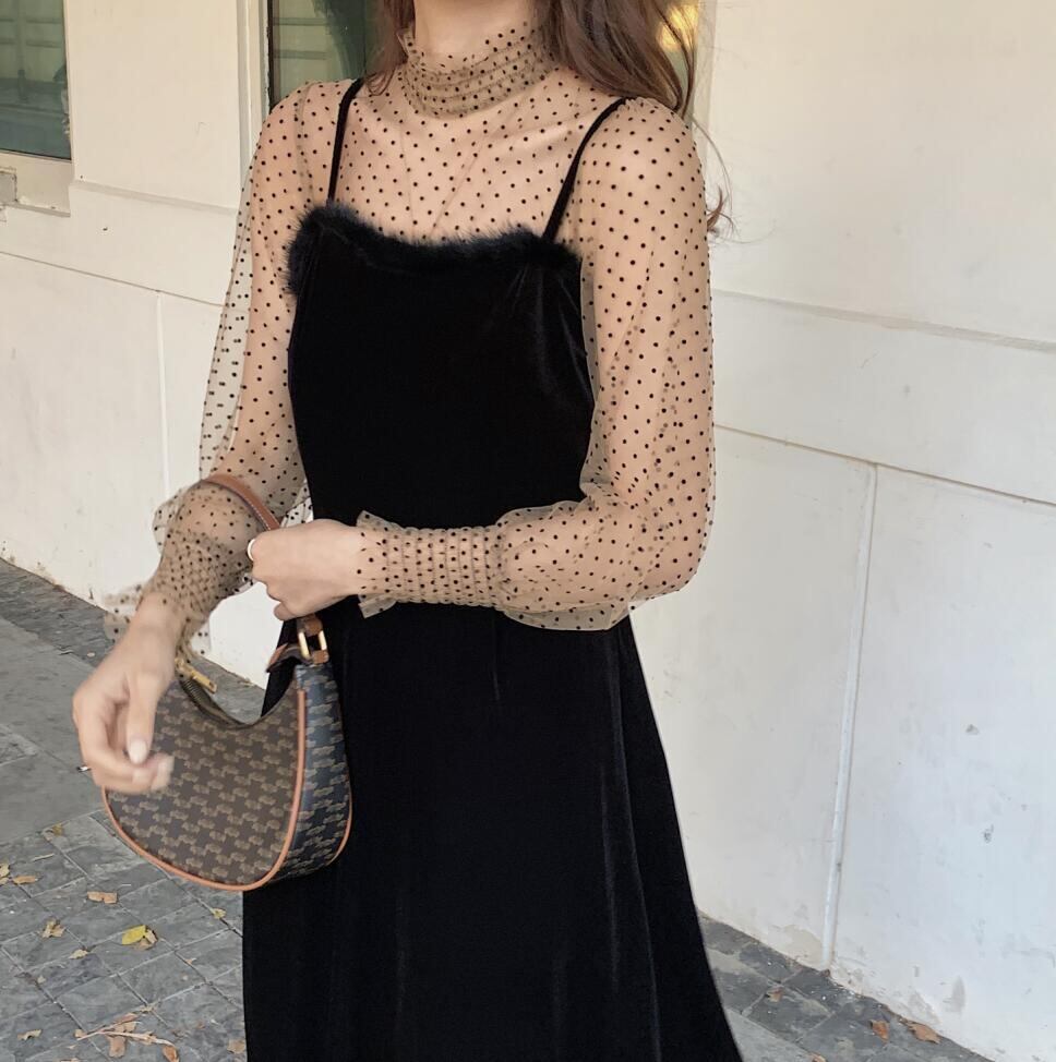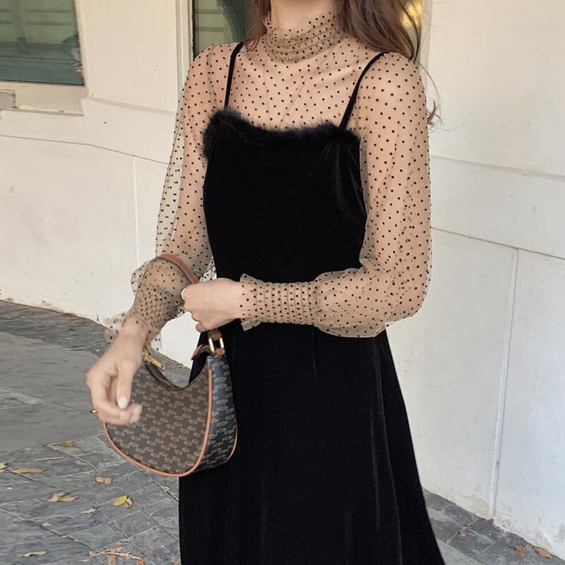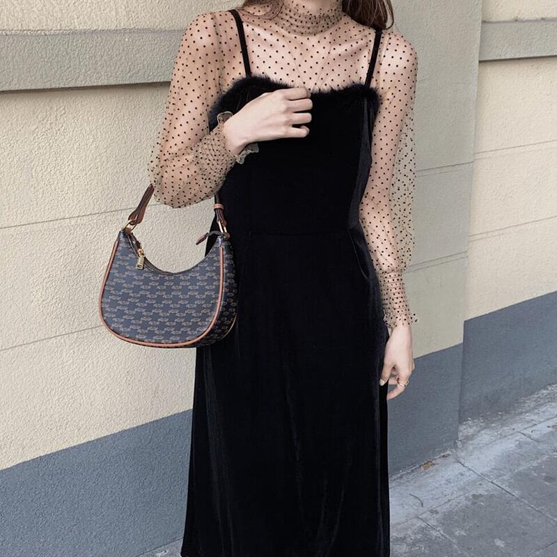 色:アプリコットメッシュ,黒のサスペンダードレス