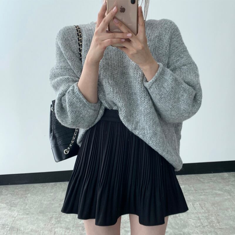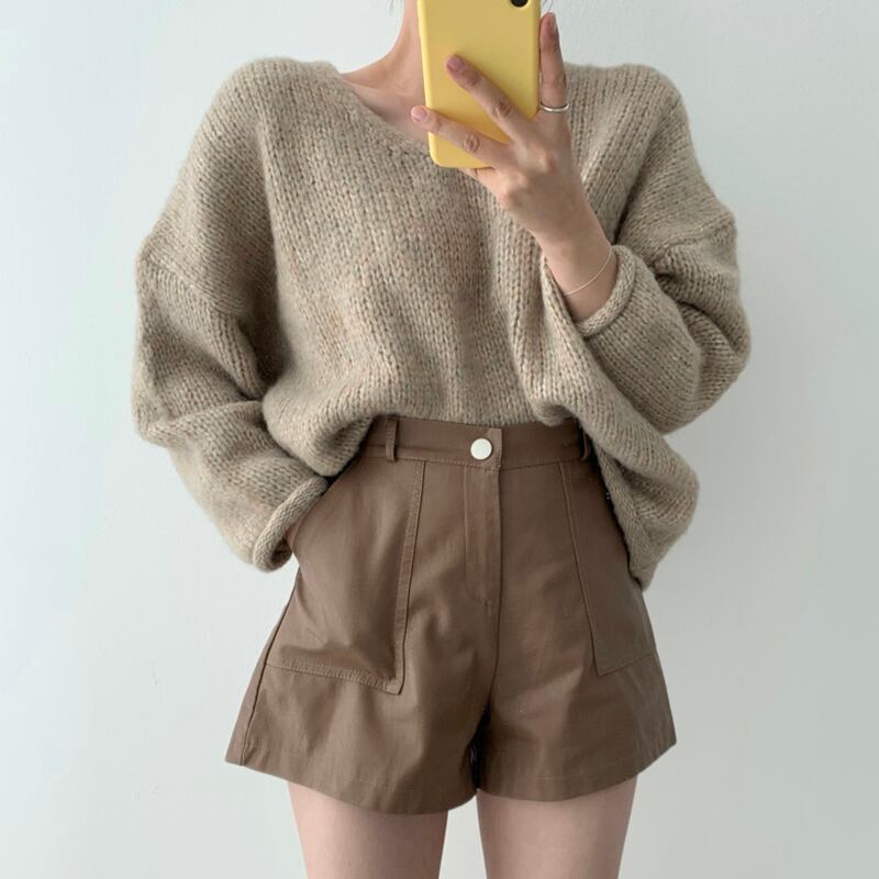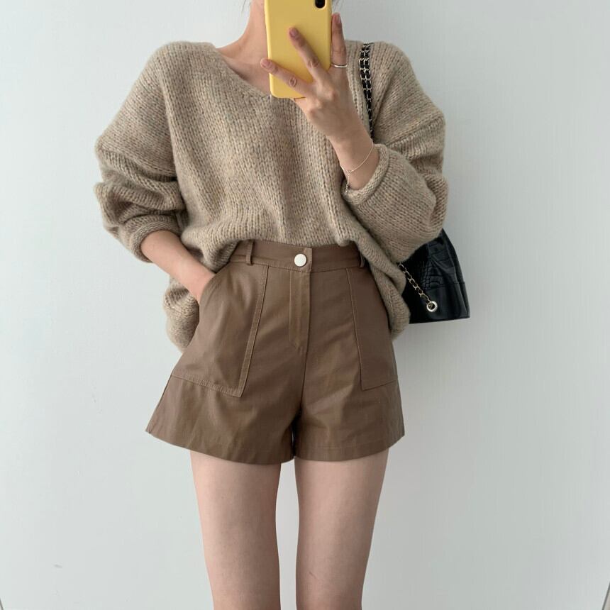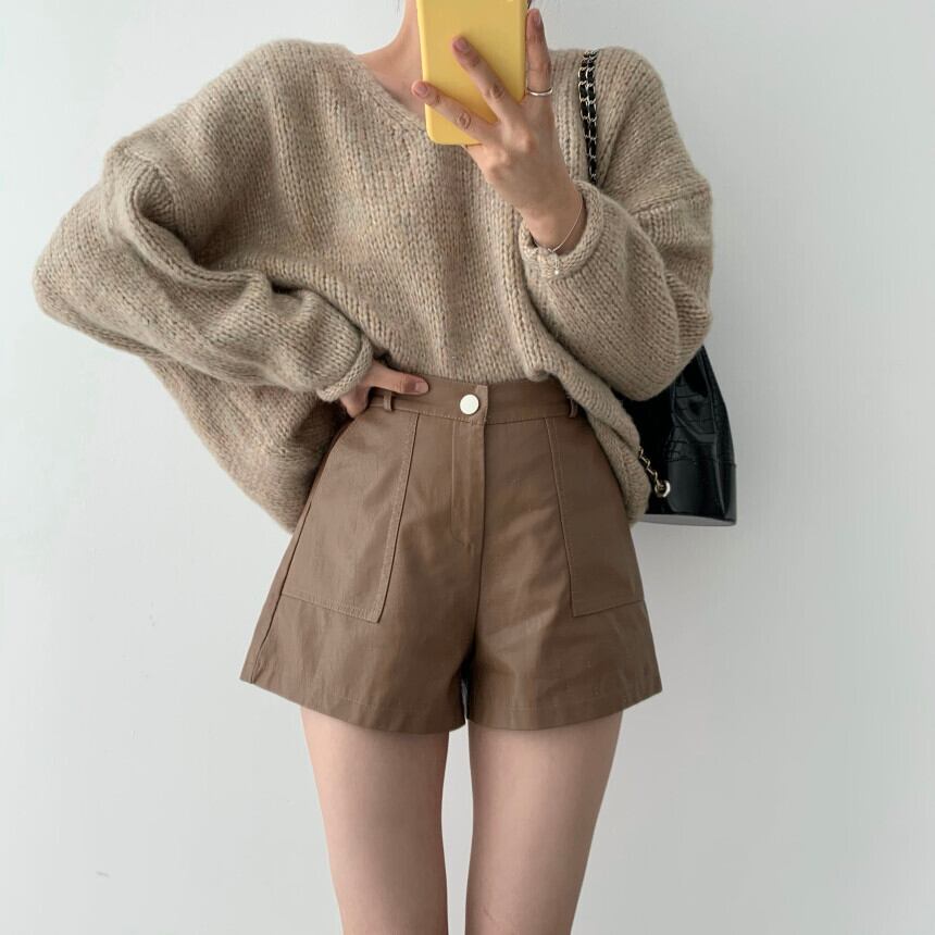 【韓国ファッション】大人可愛い スタンダードVネックルーズスリーブニットセーター ハイウェストウェストダブルポケットレザーパンツ ショーツ レディース レトロ ブルマー ♡ 韓国73144089859 | パリジェンヌ、韓国系ファッション July