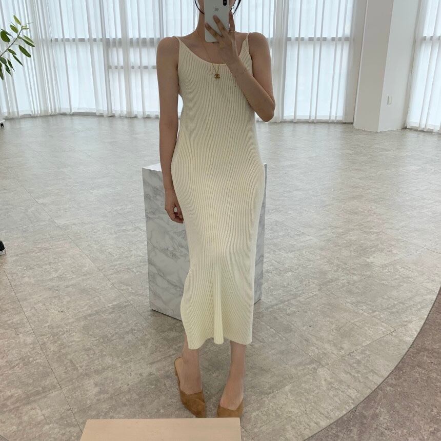 色:グリーンニットジャケット,ベージュの白いドレス,ブラックサスペンダースカート