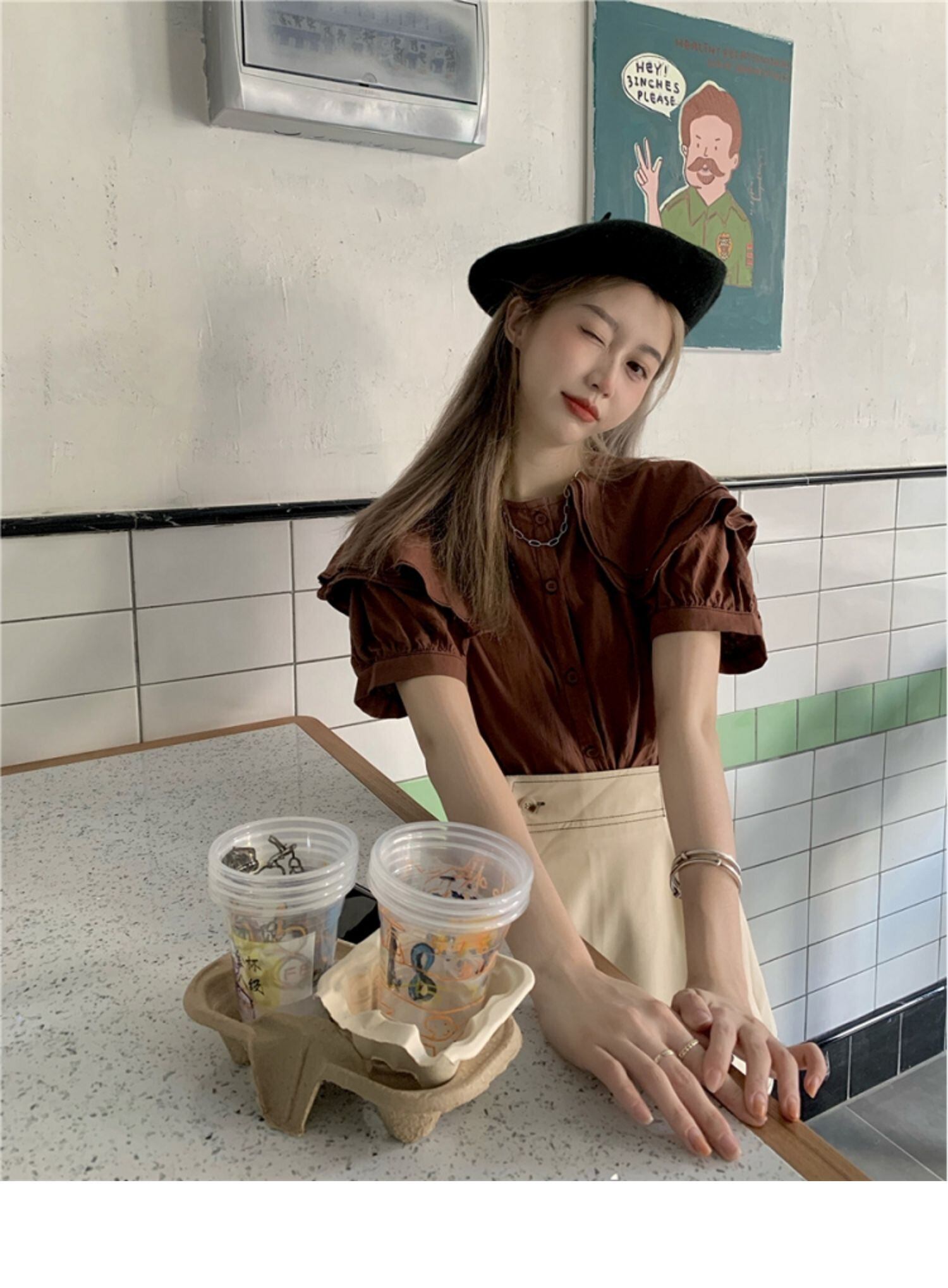 色:茶色のシャツ,アプリコットキュロットS,アプリコットキュロットM