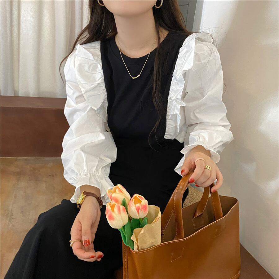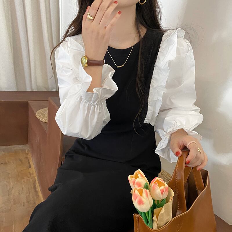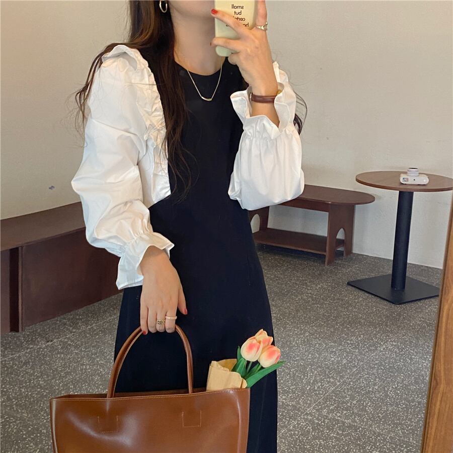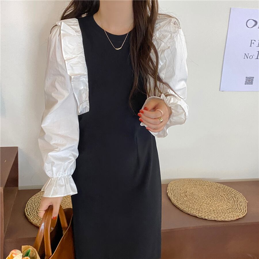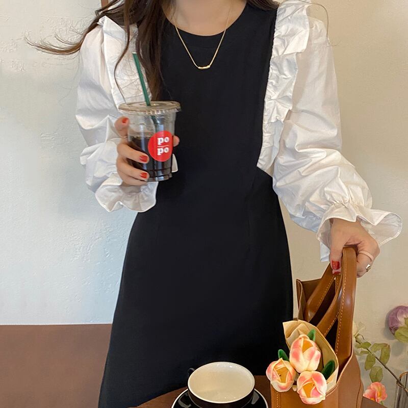 【韓国ファッション】大人可愛い スタンダードラウンドネックカラーウェストスリーブドレス ブラック レッド レトロ Oネック ステッチ ♡ 韓国78995260341 | パリジェンヌ、韓国系ファッション July