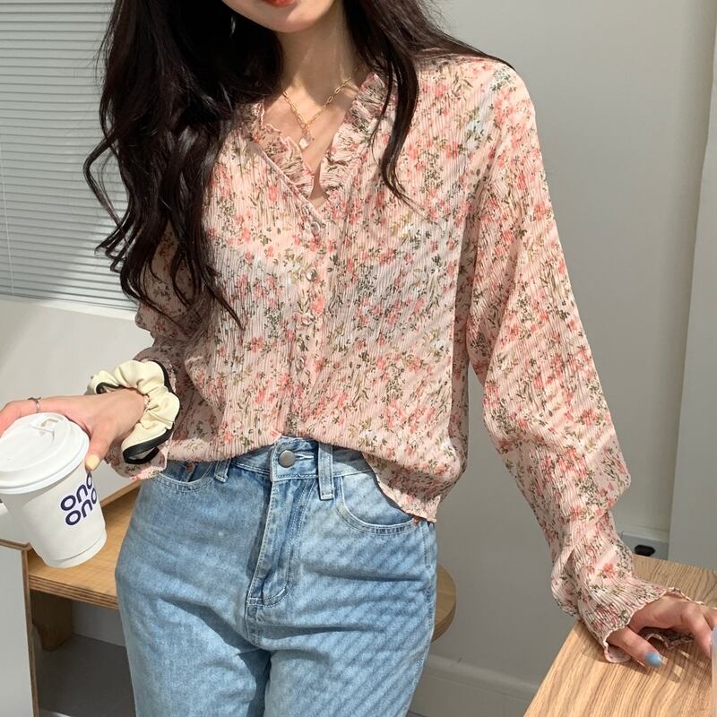 韓国服 スタンダードフローラルシャツ オータムスタイルVネックルーズスリムトップス ピンク レトロ 秋物 花柄 ♡ nanfeng97885532568 | パリジェンヌ、韓国系ファッション July