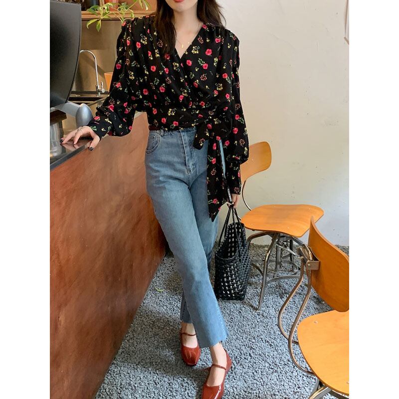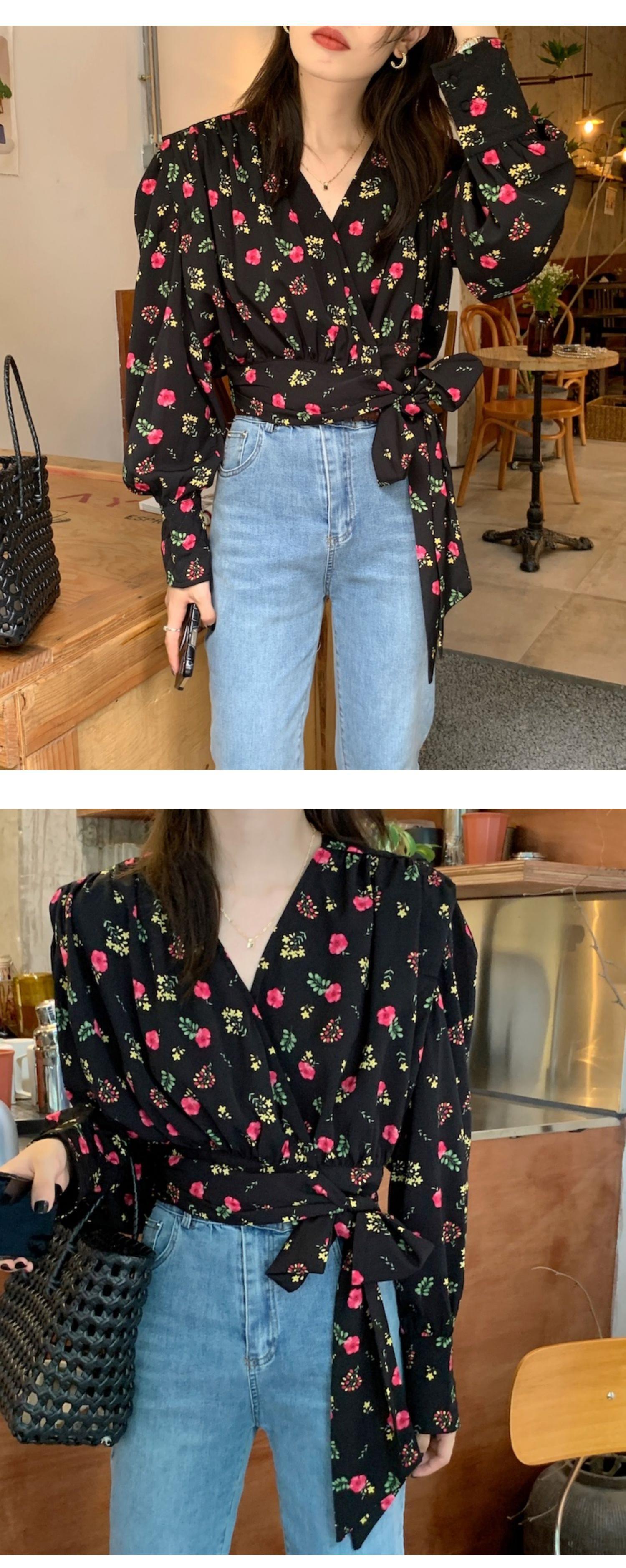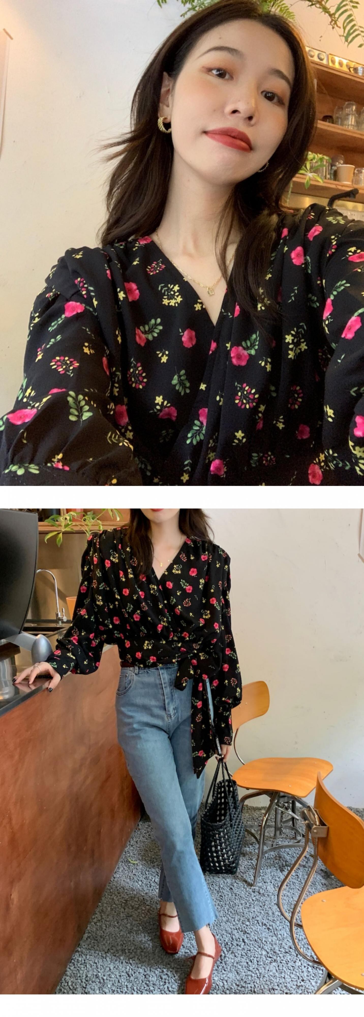 韓国服 スタンダードVネックスリーブフローラルシャツ ワンピースショートトップス ロング レトロ レース 花柄 レースアップ ♡ nanfeng55614928822 | パリジェンヌ、韓国系ファッション July