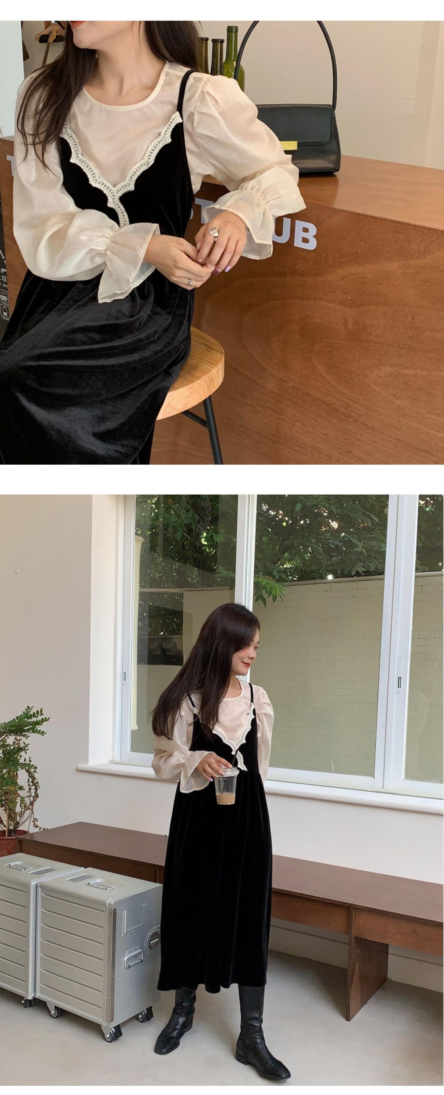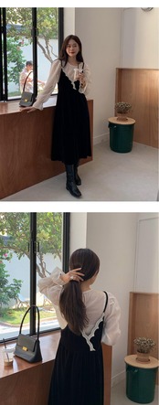 色:オフホワイトのシャツ,ブラックサスペンダースカート