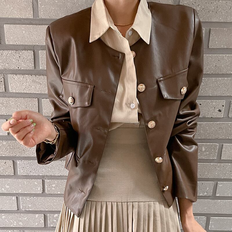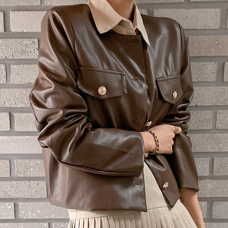 【韓国ファッション】大人可愛い オータムラウンドネックメタルバックルルーズジャケット レザー 秋物 Oネック ポケット多め マルチポケット ♡ 韓国46023891720 | パリジェンヌ、韓国系ファッション July