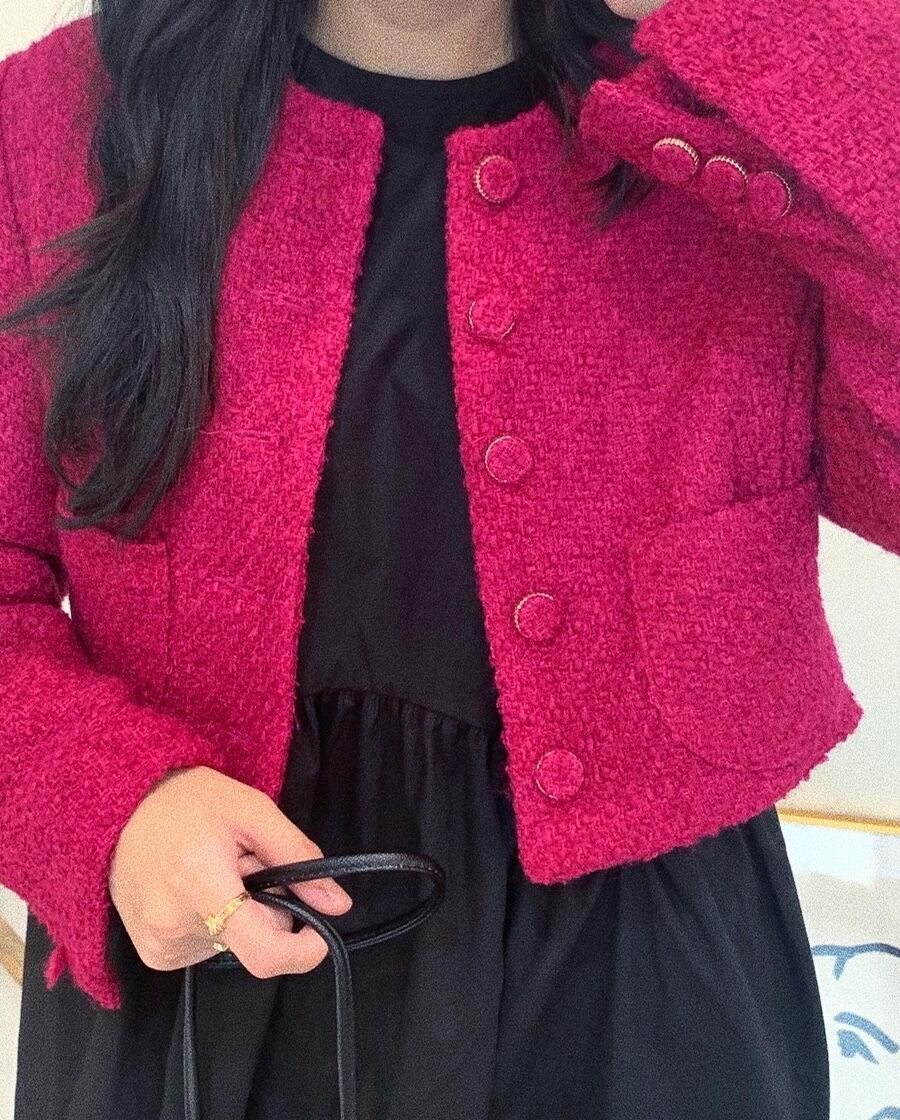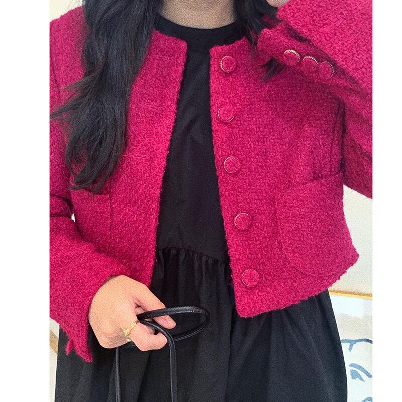 【韓国ファッション】大人可愛い スタンダードラウンドネックレッドルーズダブルツィードジャケット ロング レトロ Oネック ♡ 韓国77179763096 | パリジェンヌ、韓国系ファッション July
