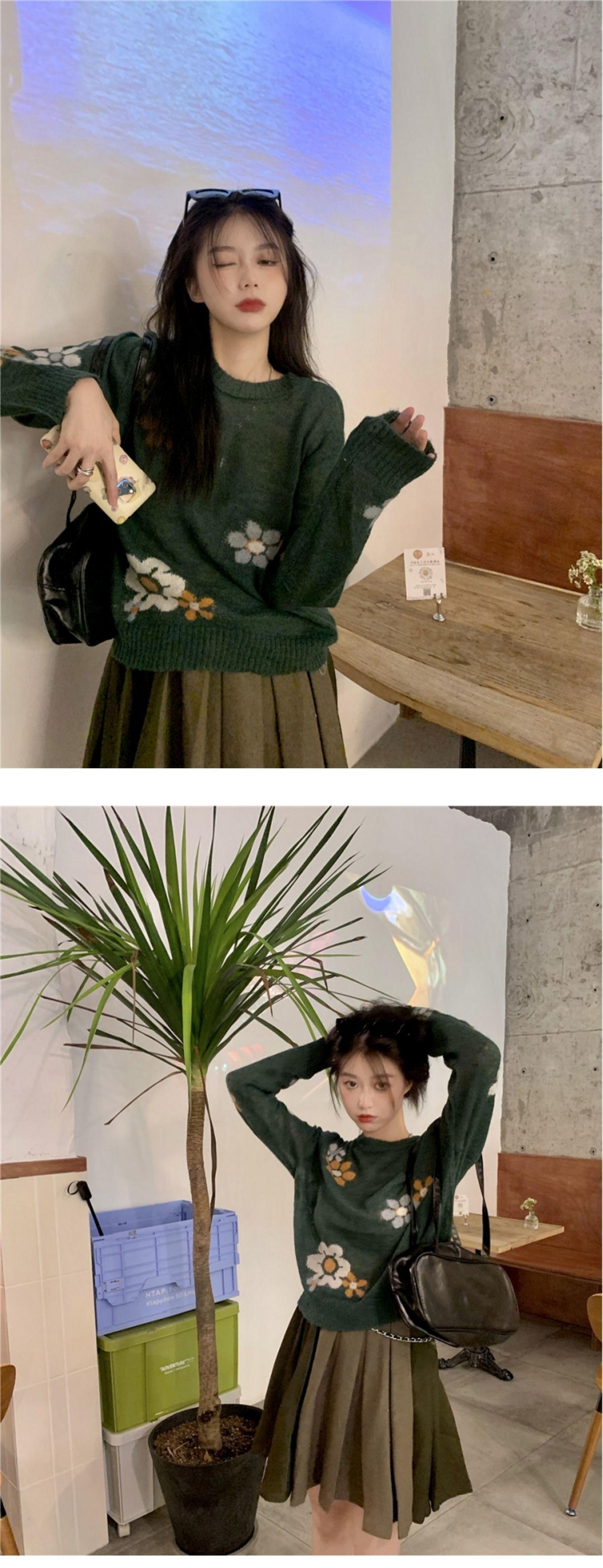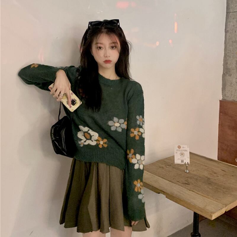 韓国服 オータムラウンドネックプルオーバー グリーンFlowerデザイン セーター ルーズニットカジュアルトップス ロング 秋物 Oネック フラワーデザイン ♡ nanfeng3893731114 | パリジェンヌ、韓国系ファッション July