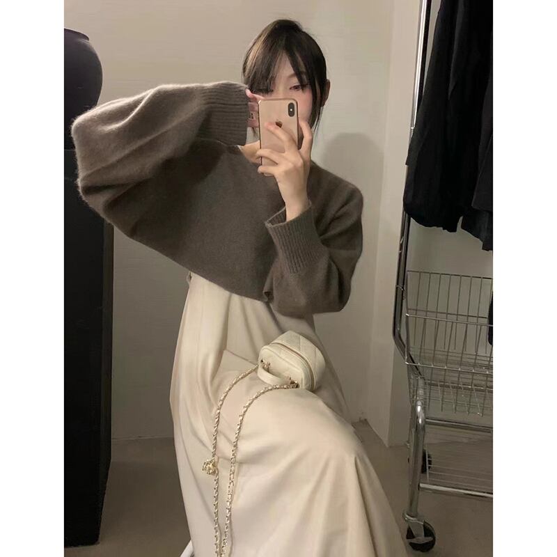 色:カーキ色のセーター,黒いセーター,乳白色のセーター,アプリコットドレス,ブラウンサスペンダードレス