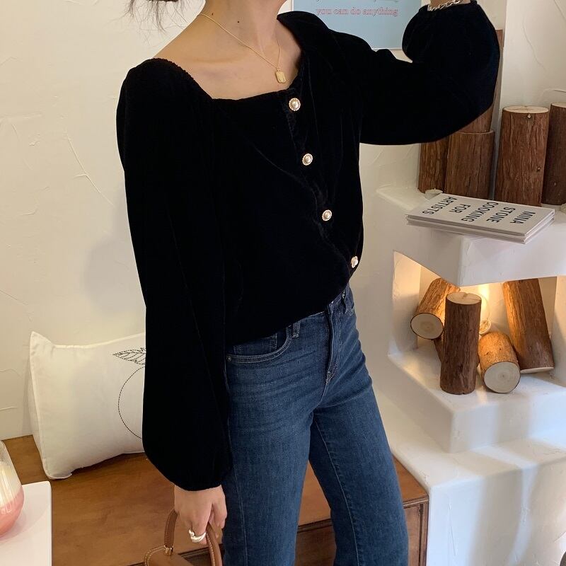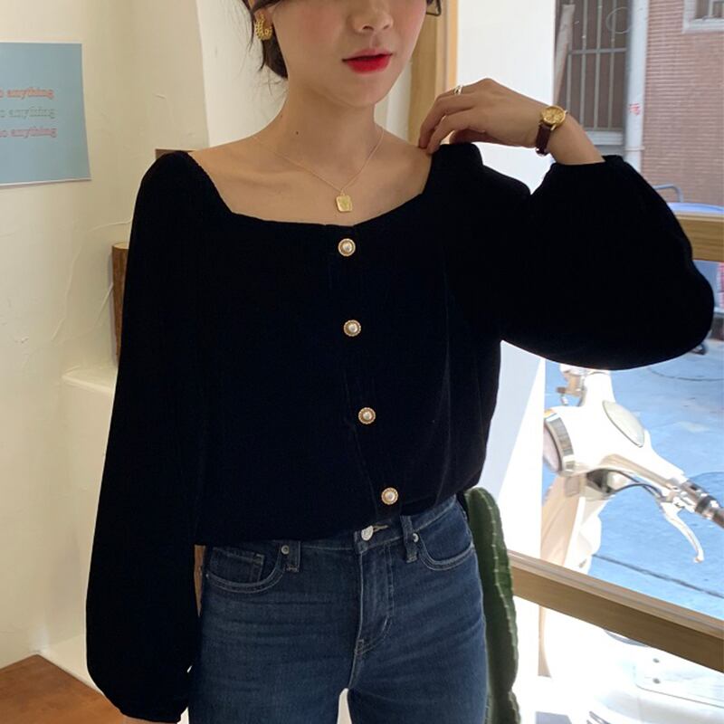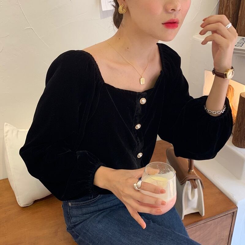 【韓国ファッション】大人可愛い スタンダード薄手カラーパールボタンスリーブショートベルベットシャツ トップス レディース レトロ 真珠 スクウェア ♡ 韓国97216949943 | パリジェンヌ、韓国系ファッション July