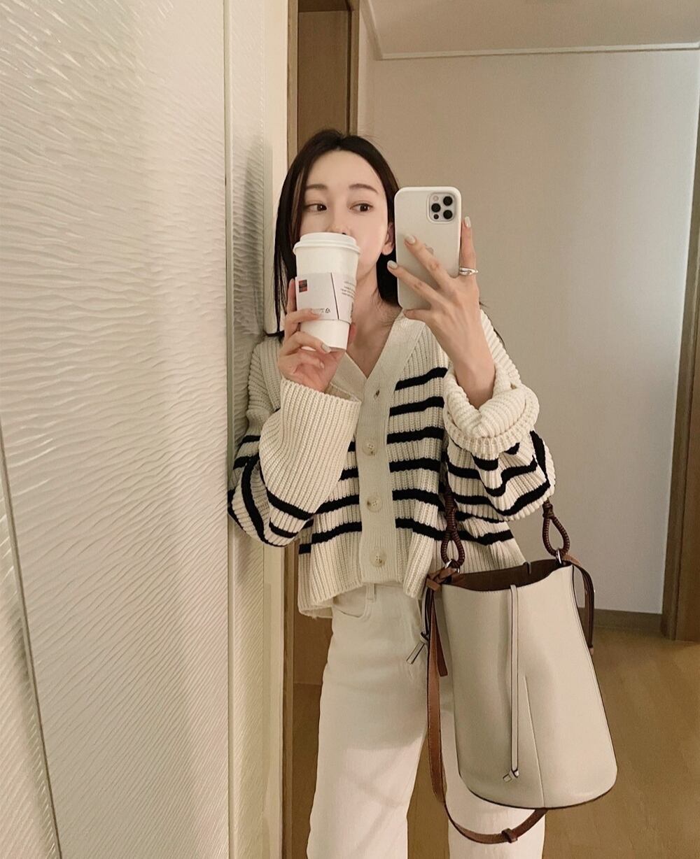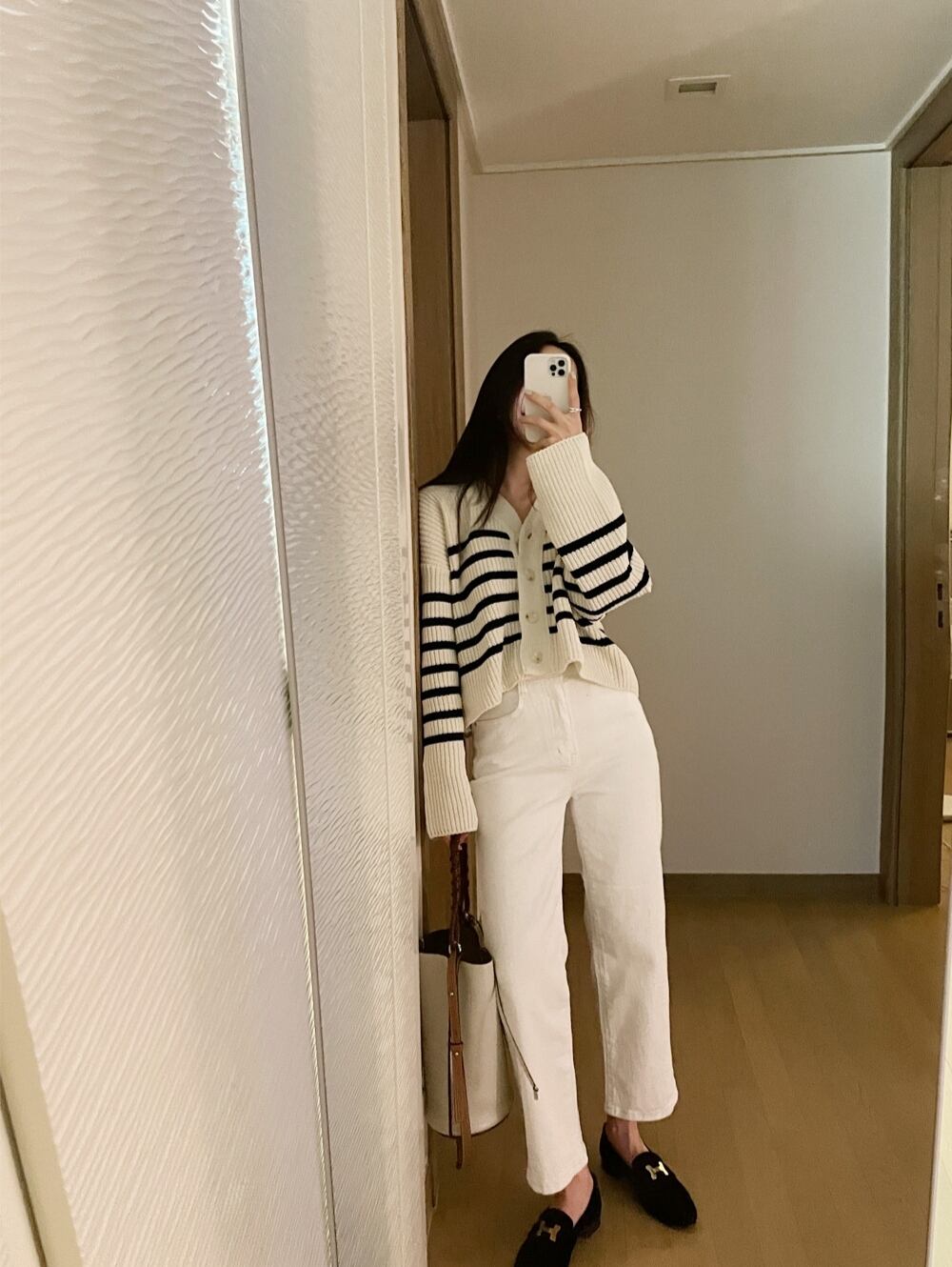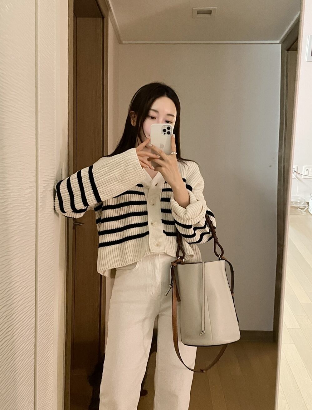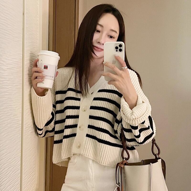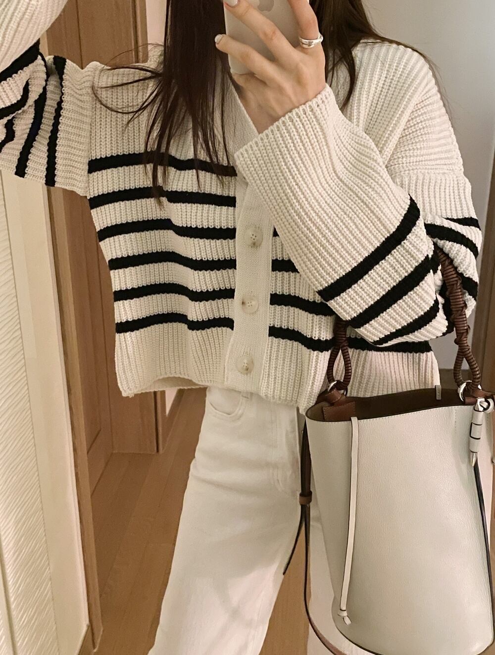 【韓国ファッション】大人可愛い カジュアルVネックカラーストライプルーズショートニットカーディガンセーター レディース ロング ♡ 韓国21028920758 | パリジェンヌ、韓国系ファッション July