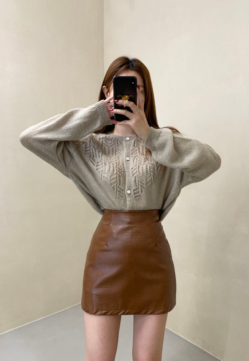 色:カーキ色のセーター,白いセーター,コーヒー色の革スカートS,コーヒー色の革スカートM,コーヒー色の革スカートL