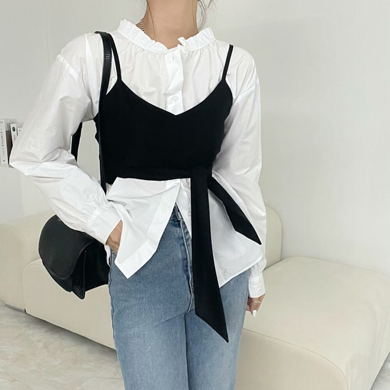 色:黒のサスペンダー付きの白いシャツ,白いサスペンダーと青いシャツ