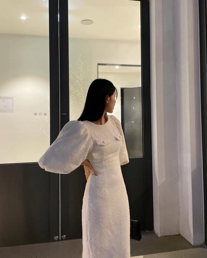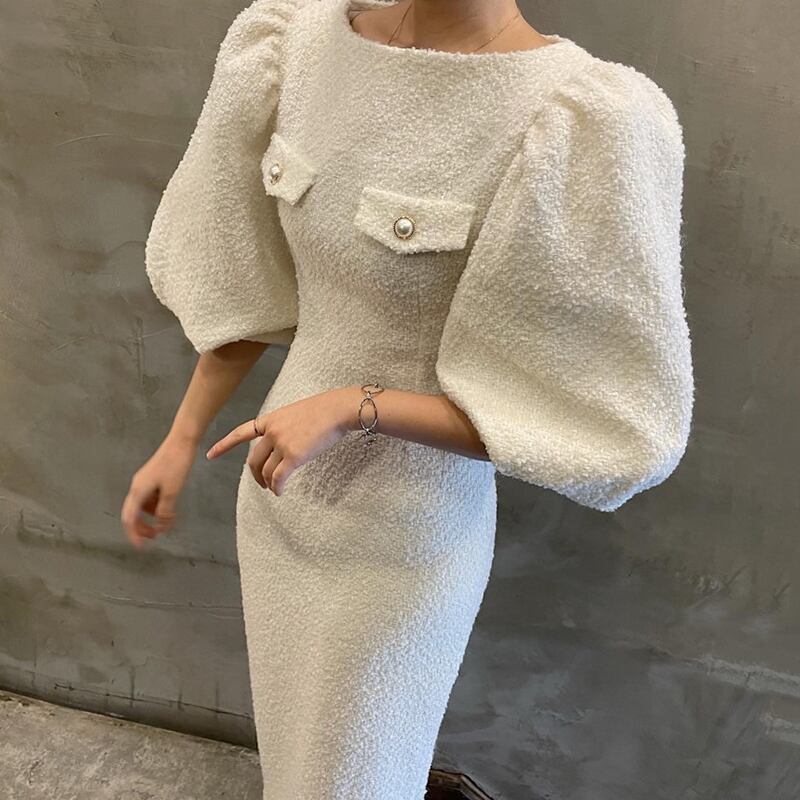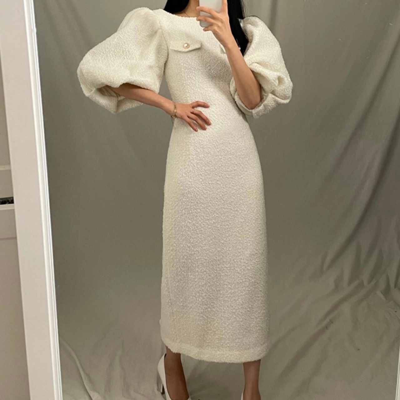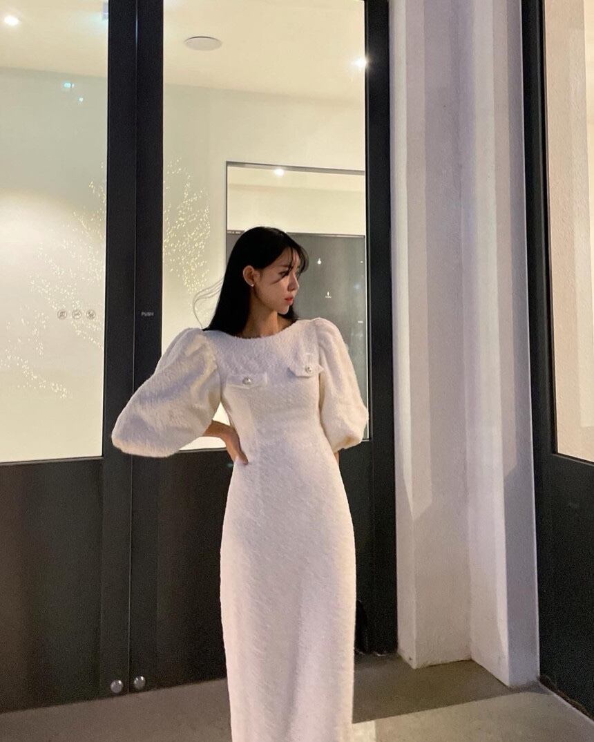 【韓国ファッション】大人可愛い ラウンドネックボタンスリムスリーブツィードドレス ランタンスリーブ スリムヒップ Oネック ♡ 韓国47722880518 | パリジェンヌ、韓国系ファッション July