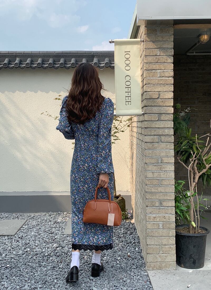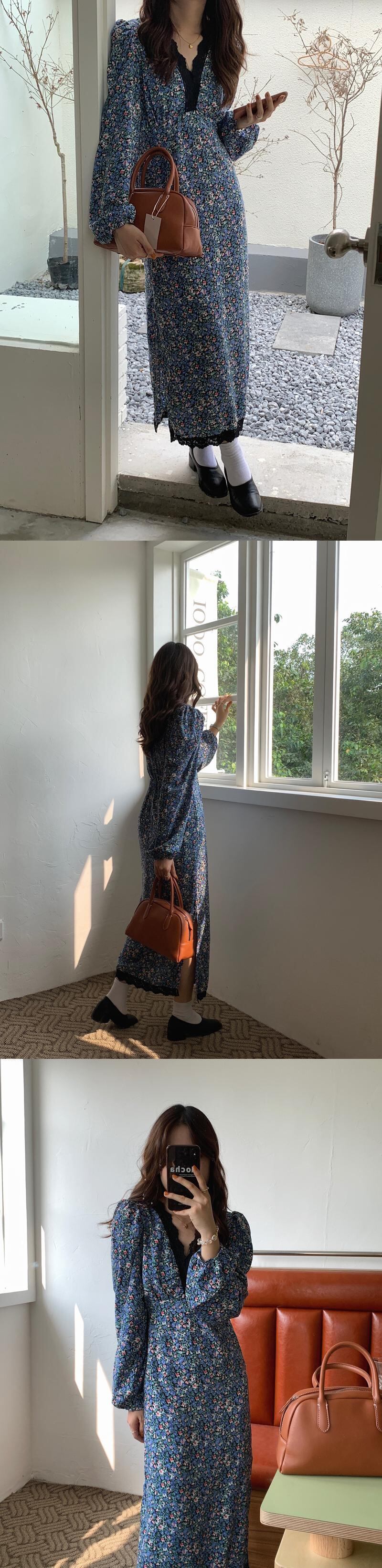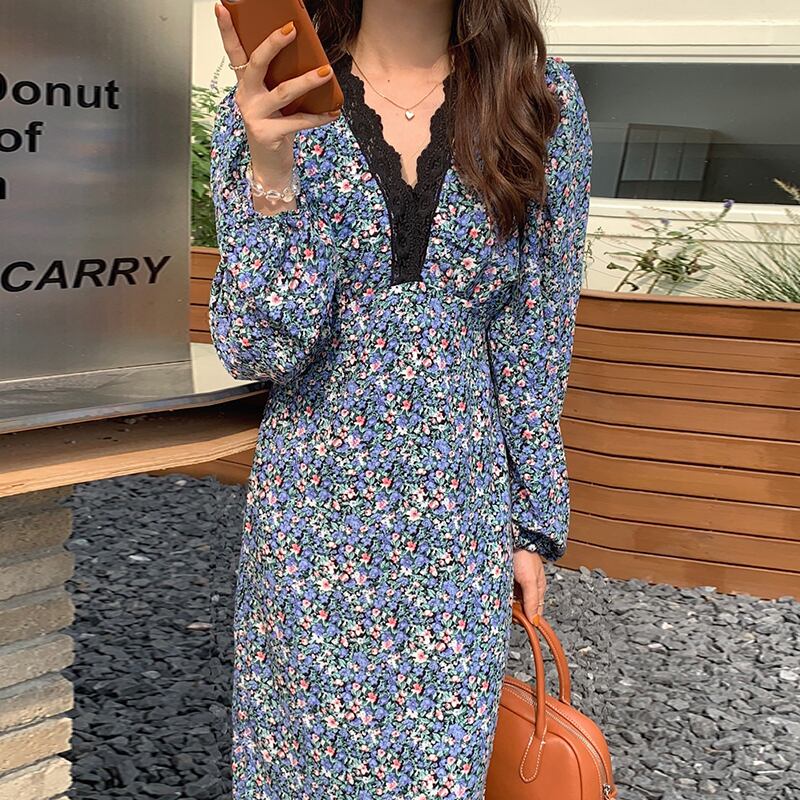 【韓国ファッション】大人可愛い オータムスタンダードVネックレースウェストスリーブフローラルドレス ロング レトロ 秋物 花柄 ステッチ ♡ 韓国19126160482 | パリジェンヌ、韓国系ファッション July