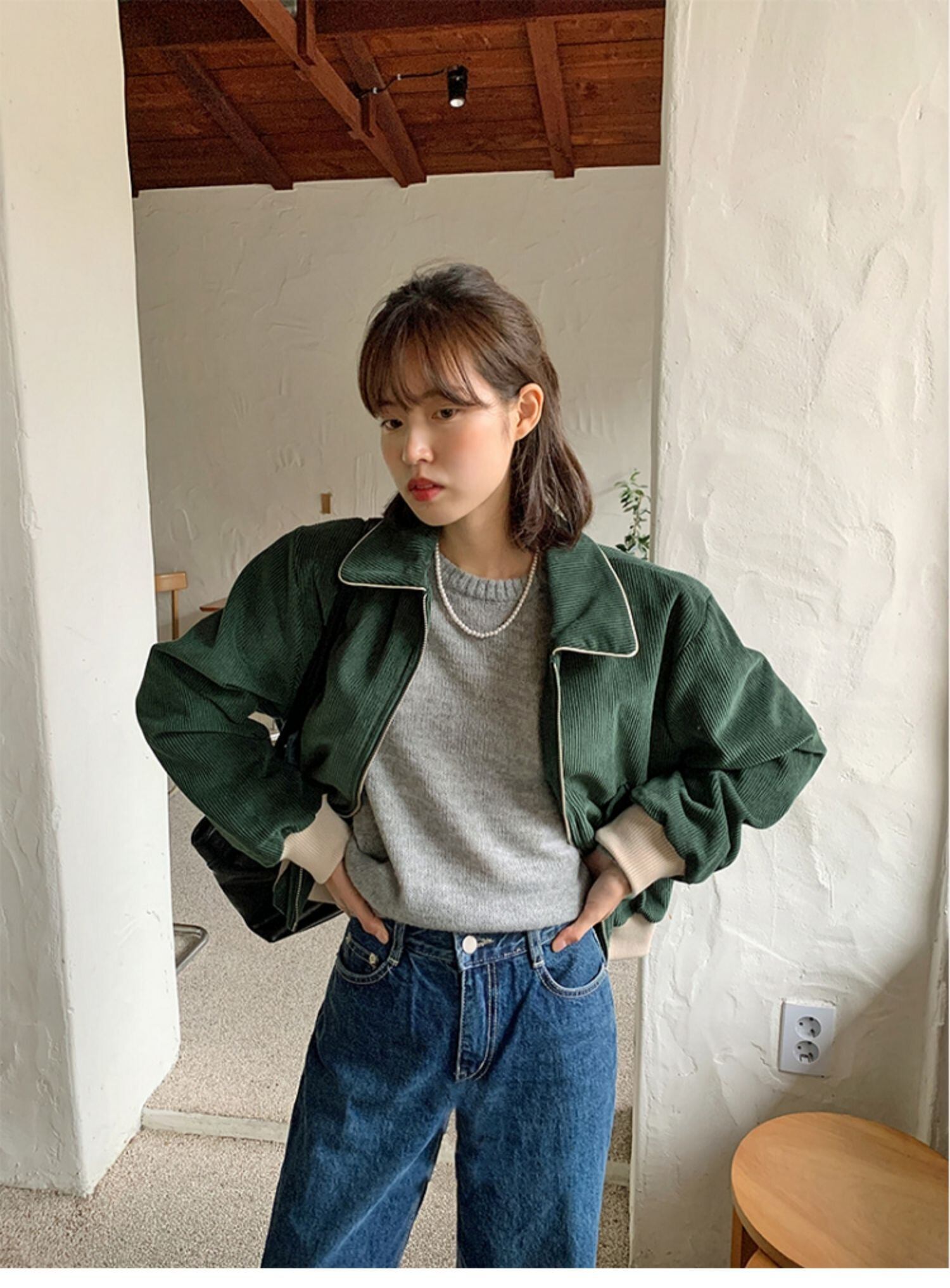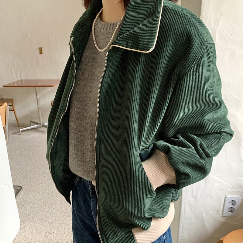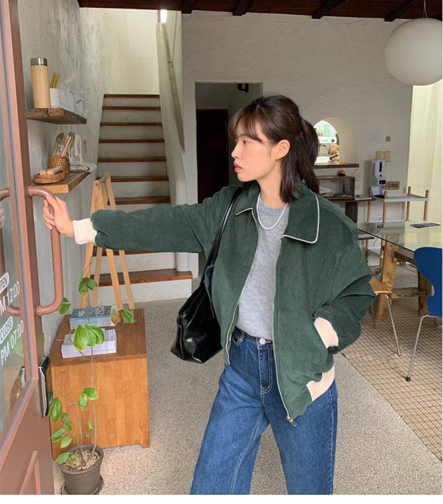 韓国服 グリーンコーデュロイジャケット オータムウィンタースタンダードカラールーズショートコート レトロ 秋物 冬物 ステッチ ♡ nanfeng21466686684 | パリジェンヌ、韓国系ファッション July