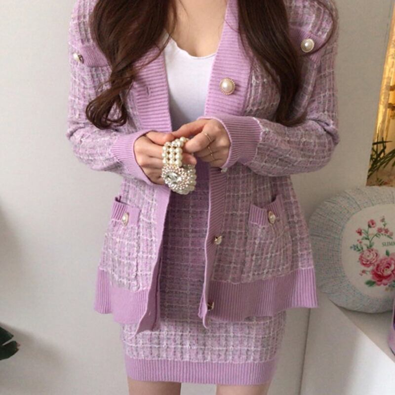 【韓国ファッション】大人可愛い オータムスタンダードVネックパールバックルニットジャケット ハイウェストウェストスカート レトロ 秋物 真珠 ♡ 韓国11987321600 | パリジェンヌ、韓国系ファッション July
