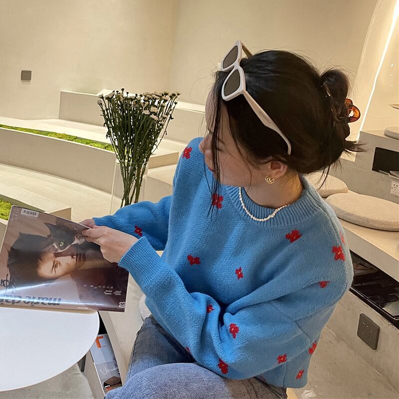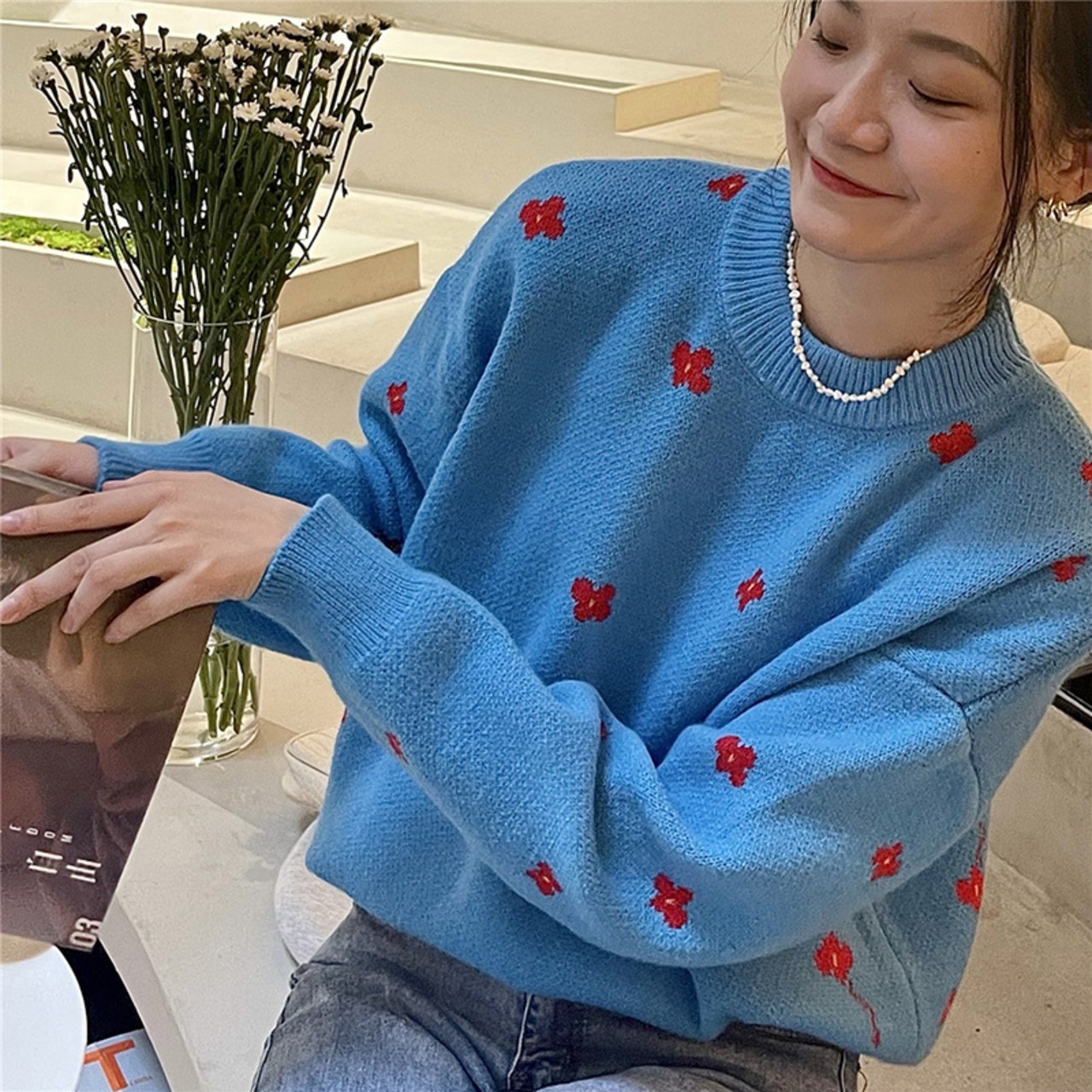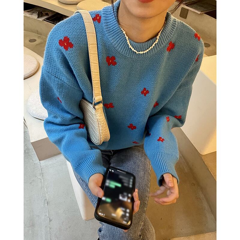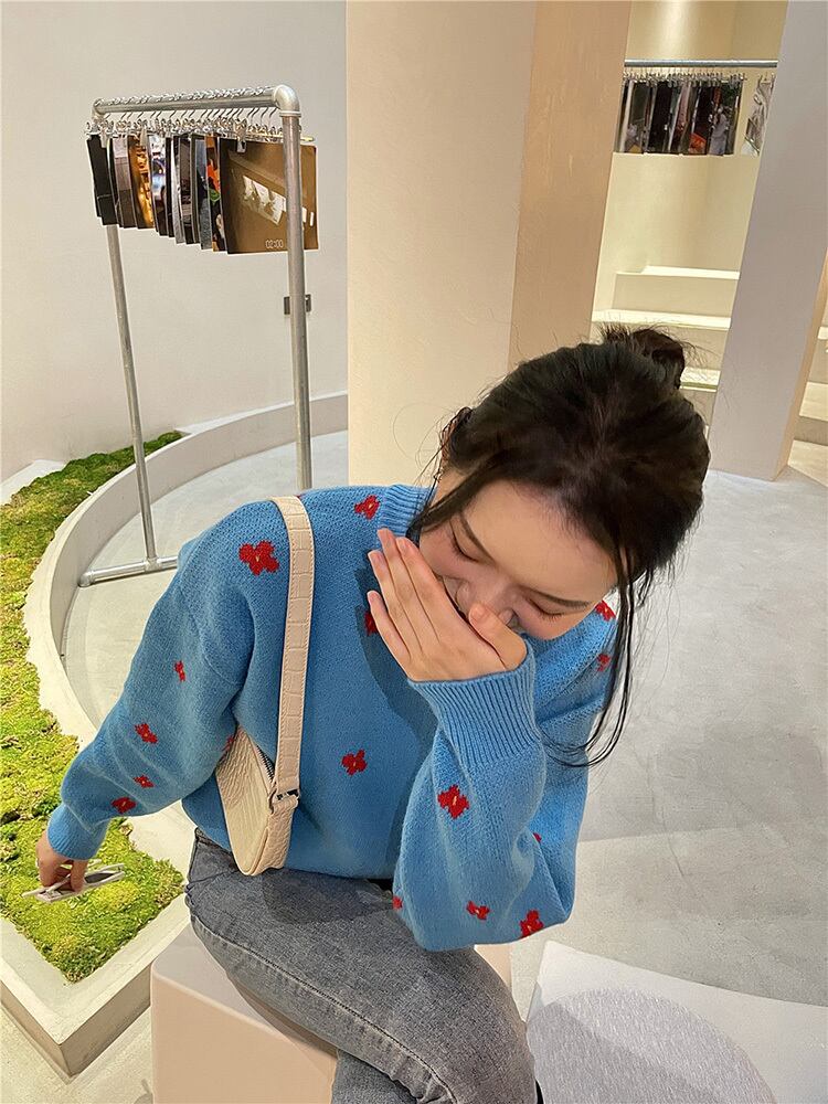 韓国服 ブルーフローラルセーター ルーズオータムウィンターラウンドネックプルオーバー 秋物 冬物 花柄 Oネック ♡ nanfeng29499295134 | パリジェンヌ、韓国系ファッション July
