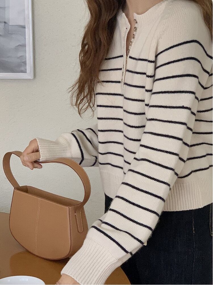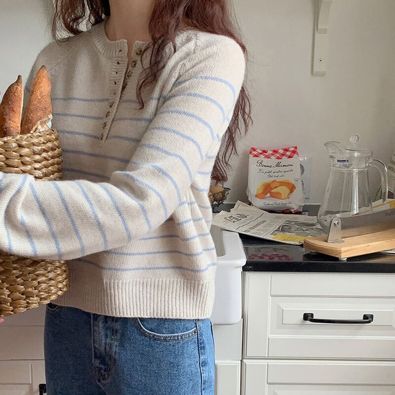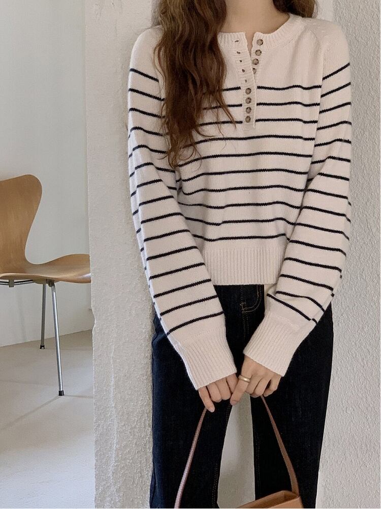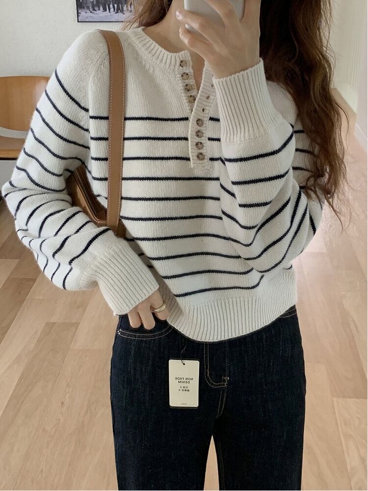 韓国服 セーター ルーズ薄手プルオーバー トップス オータムコート ボタンストライプニットシャツ ロング 秋物 ♡ nanfeng34192409774 | パリジェンヌ、韓国系ファッション July
