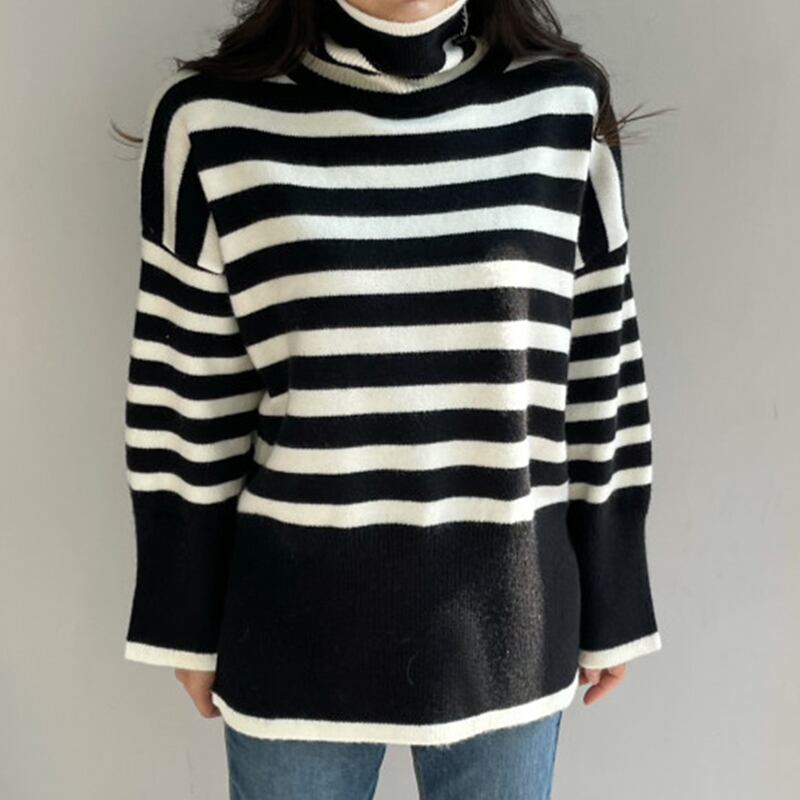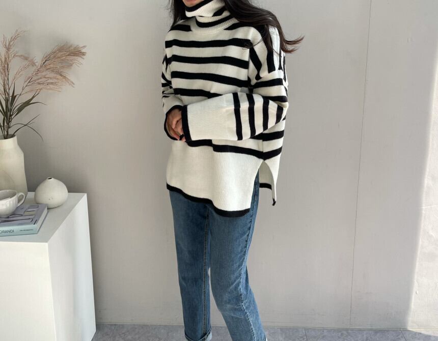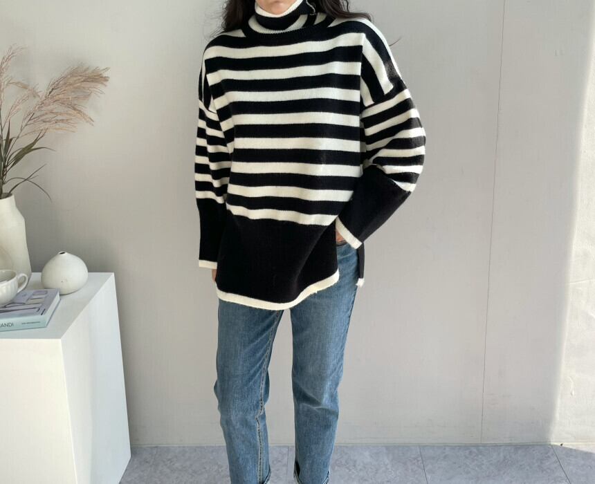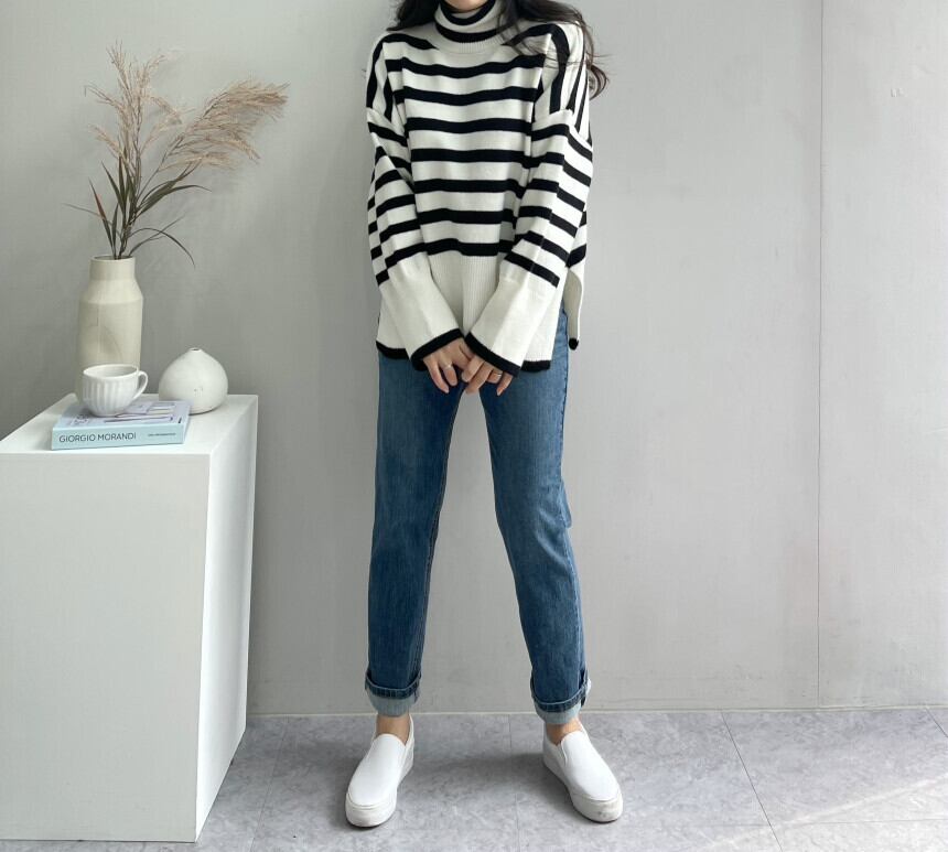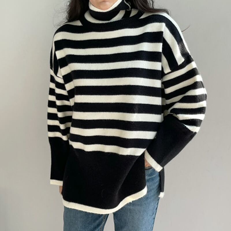 【韓国ファッション】大人可愛い オータムウィンタースタンダードカラーストライプルーズサイドスリットニットセーター ロング レトロ 秋物 冬物 ♡ 韓国22530247167 | パリジェンヌ、韓国系ファッション July