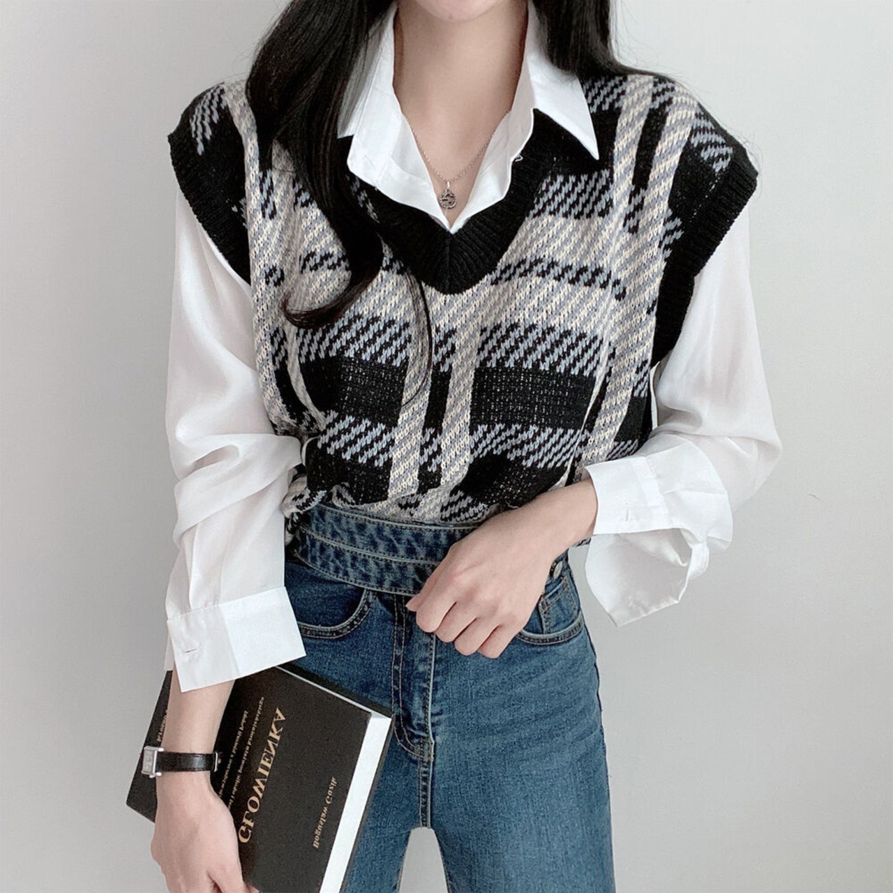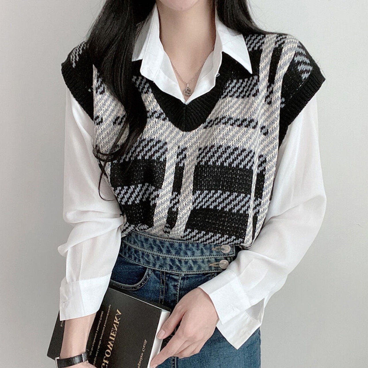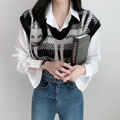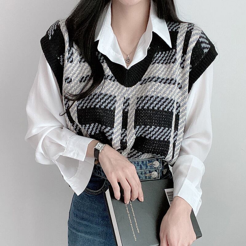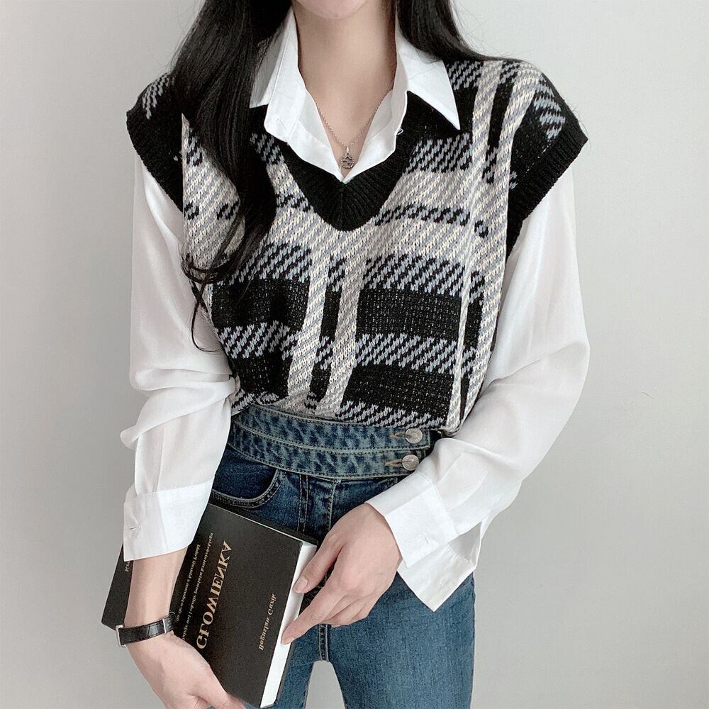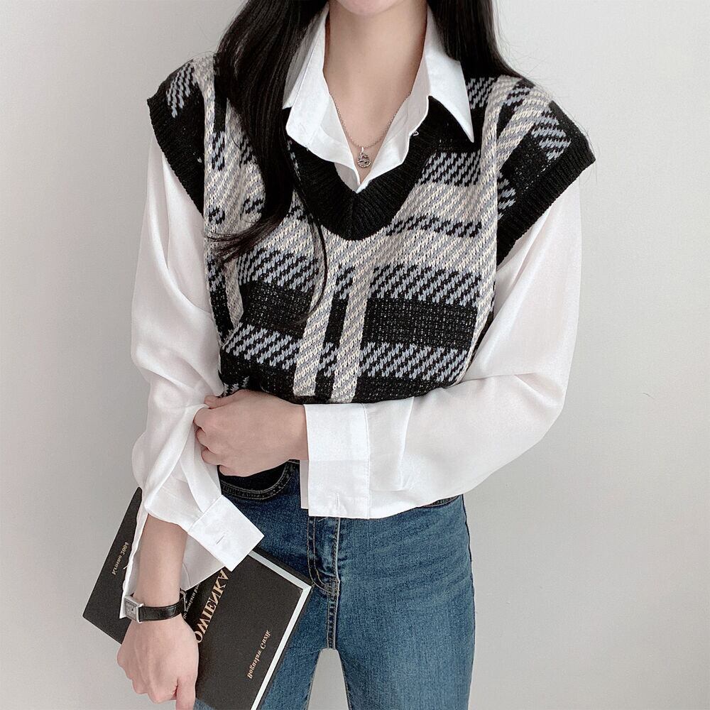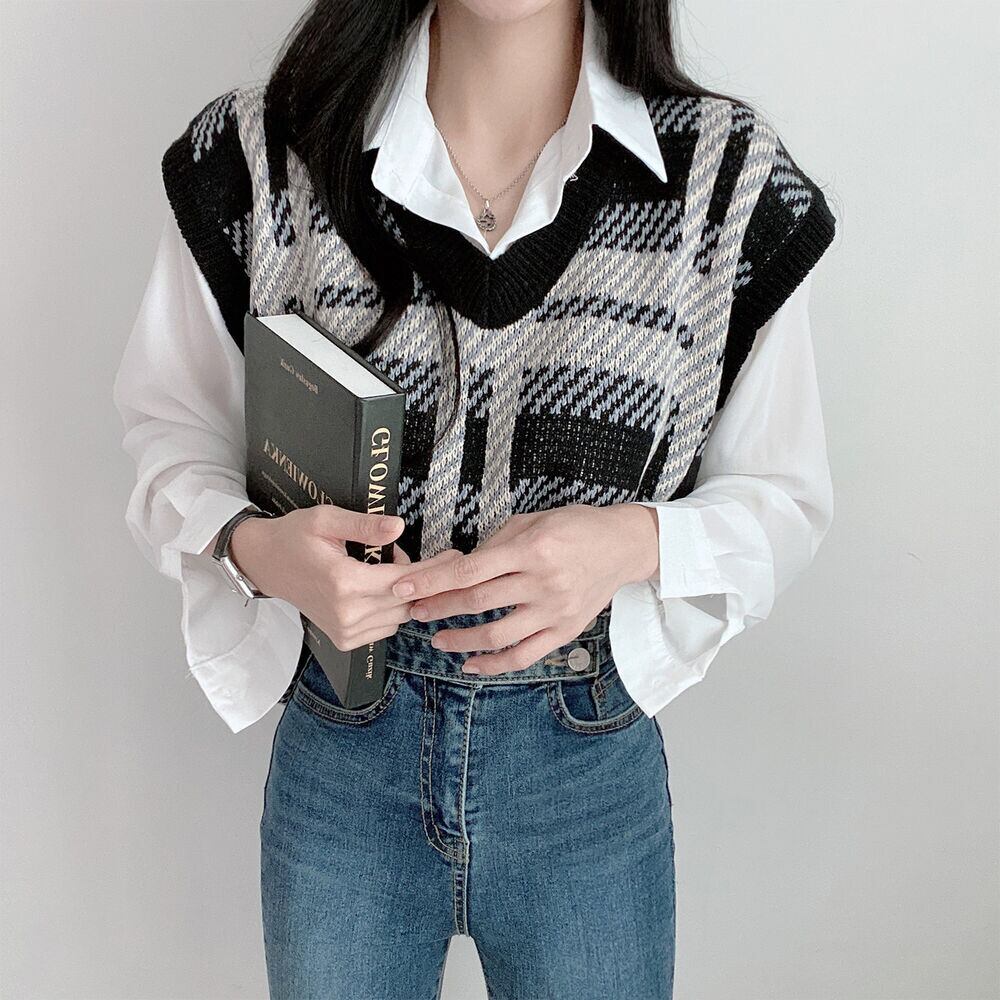 【韓国ファッション】大人可愛い オータムウィンタースタンダード格子柄Vネックカラールーズショートニットレディース レトロ 秋物 冬物 ♡ 韓国85541474579 | パリジェンヌ、韓国系ファッション July