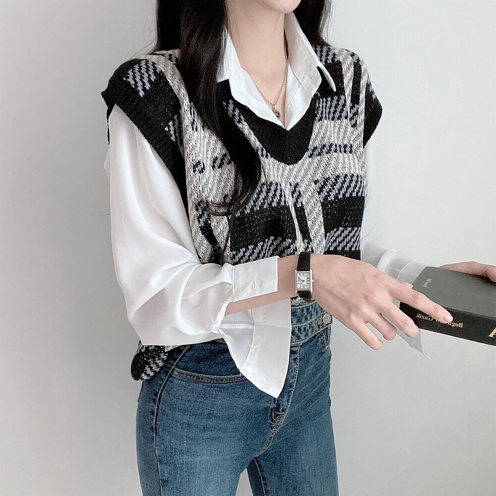 【韓国ファッション】大人可愛い オータムウィンタースタンダード格子柄Vネックカラールーズショートニットレディース レトロ 秋物 冬物 ♡ 韓国85541474579 | パリジェンヌ、韓国系ファッション July
