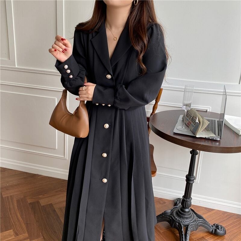 韓国服 カラー長袖スリーブスタンダードウェストドレス レディースオータムパールバックルプリーツスカート ロング レトロ 秋物 真珠 ♡ nanfeng88989239063 | パリジェンヌ、韓国系ファッション July