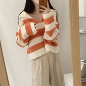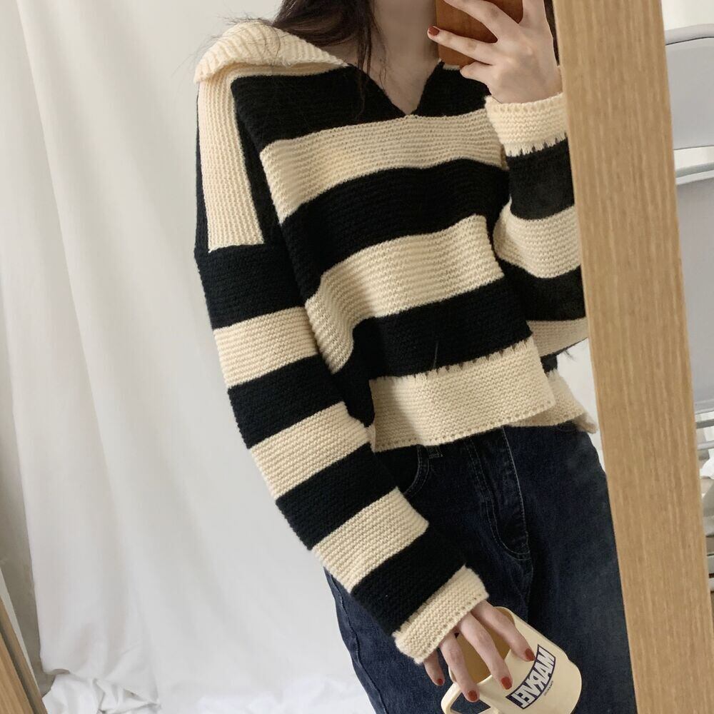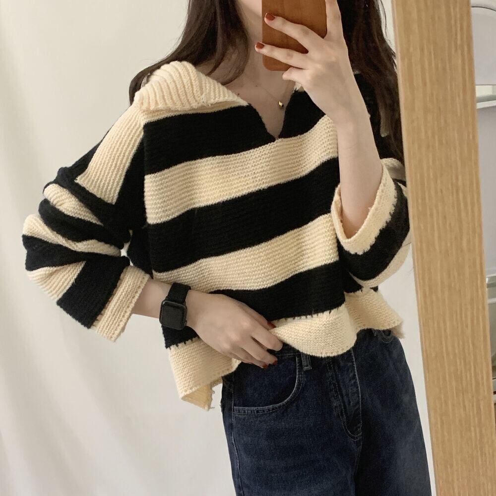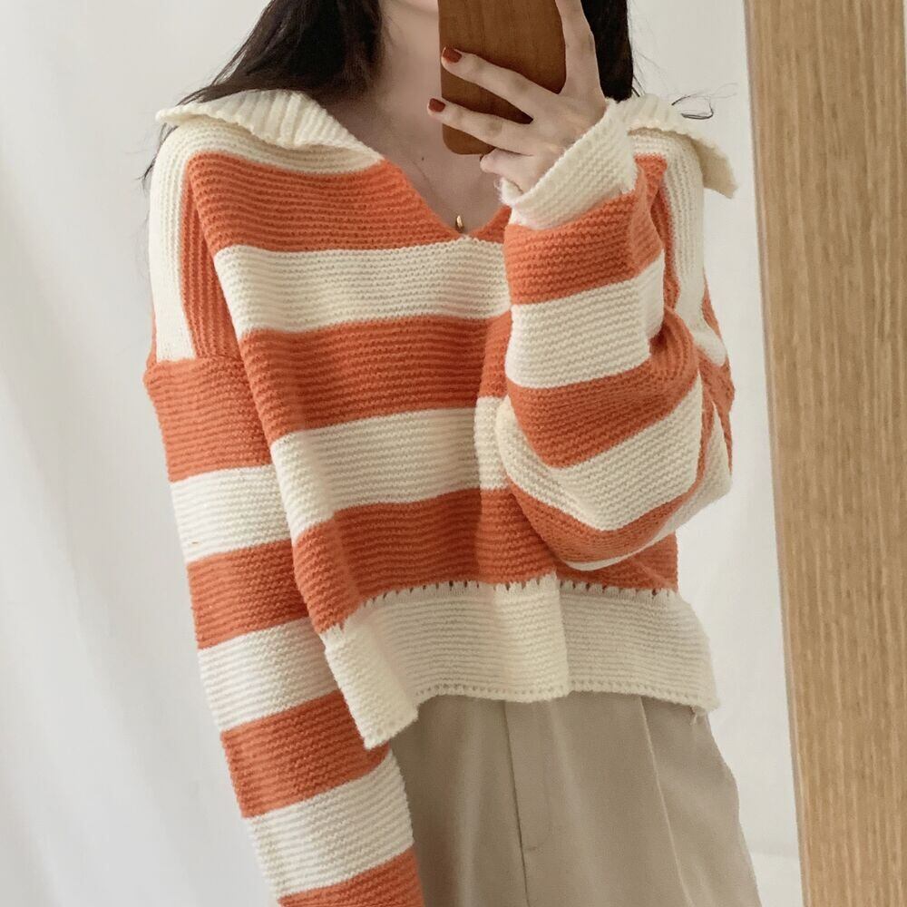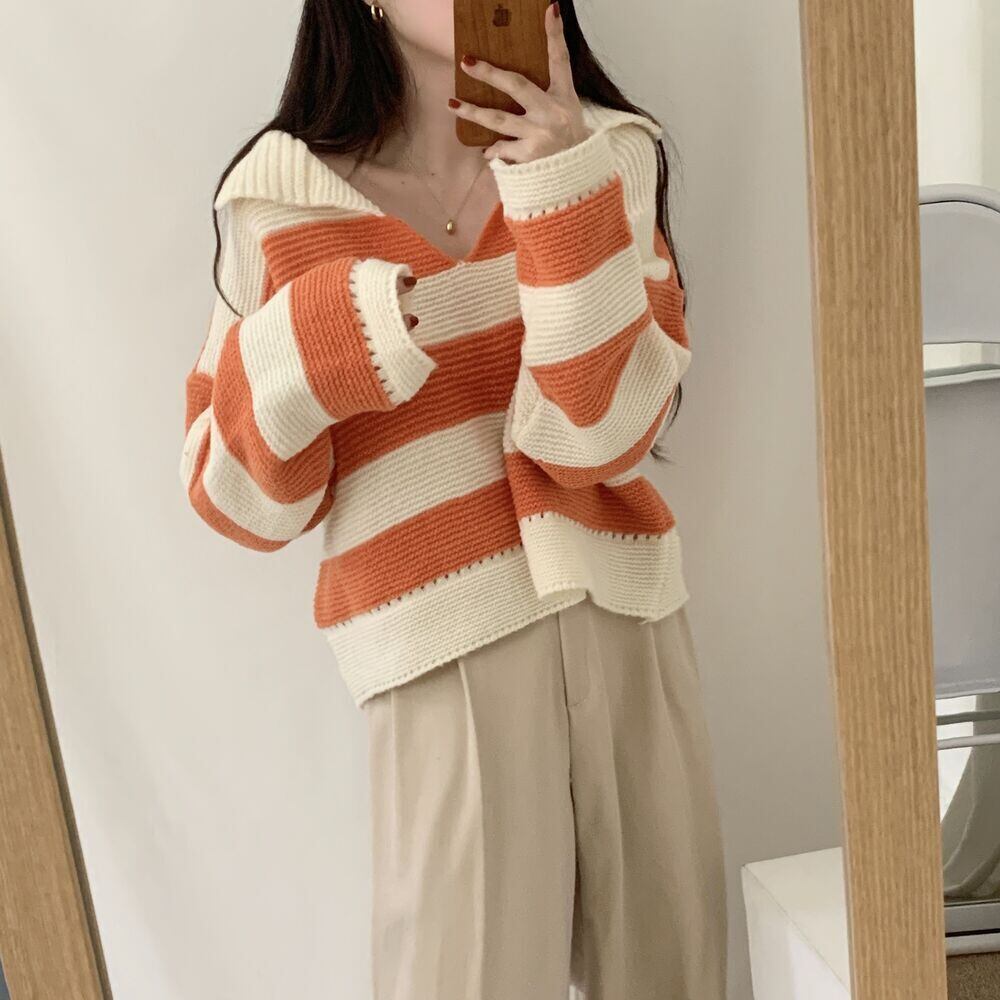 【韓国ファッション】大人可愛い オータムウィンタースタンダードカラーストライププルオーバー ルーズカジュアルニットセーター ロング レトロ 秋物 冬物 ♡ 韓国98232557112 | パリジェンヌ、韓国系ファッション July