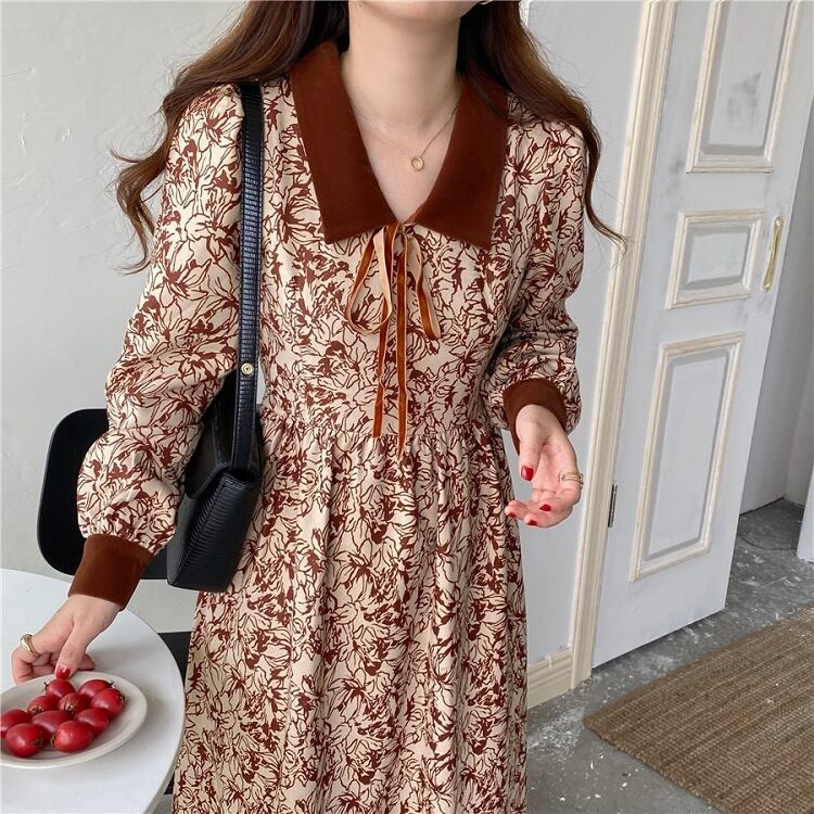 韓国服 ドレス オータムウィンタースタイルベルベットフローラルスタンダードスカート レトロ 秋物 冬物 花柄 ステッチ ♡ nanfeng79471520206 | パリジェンヌ、韓国系ファッション July