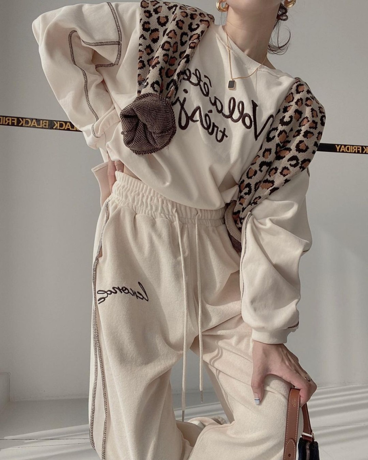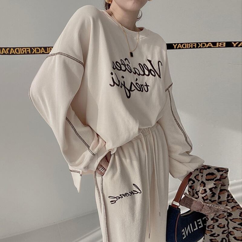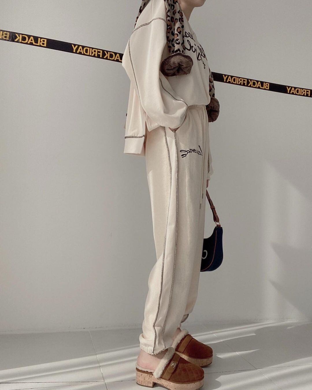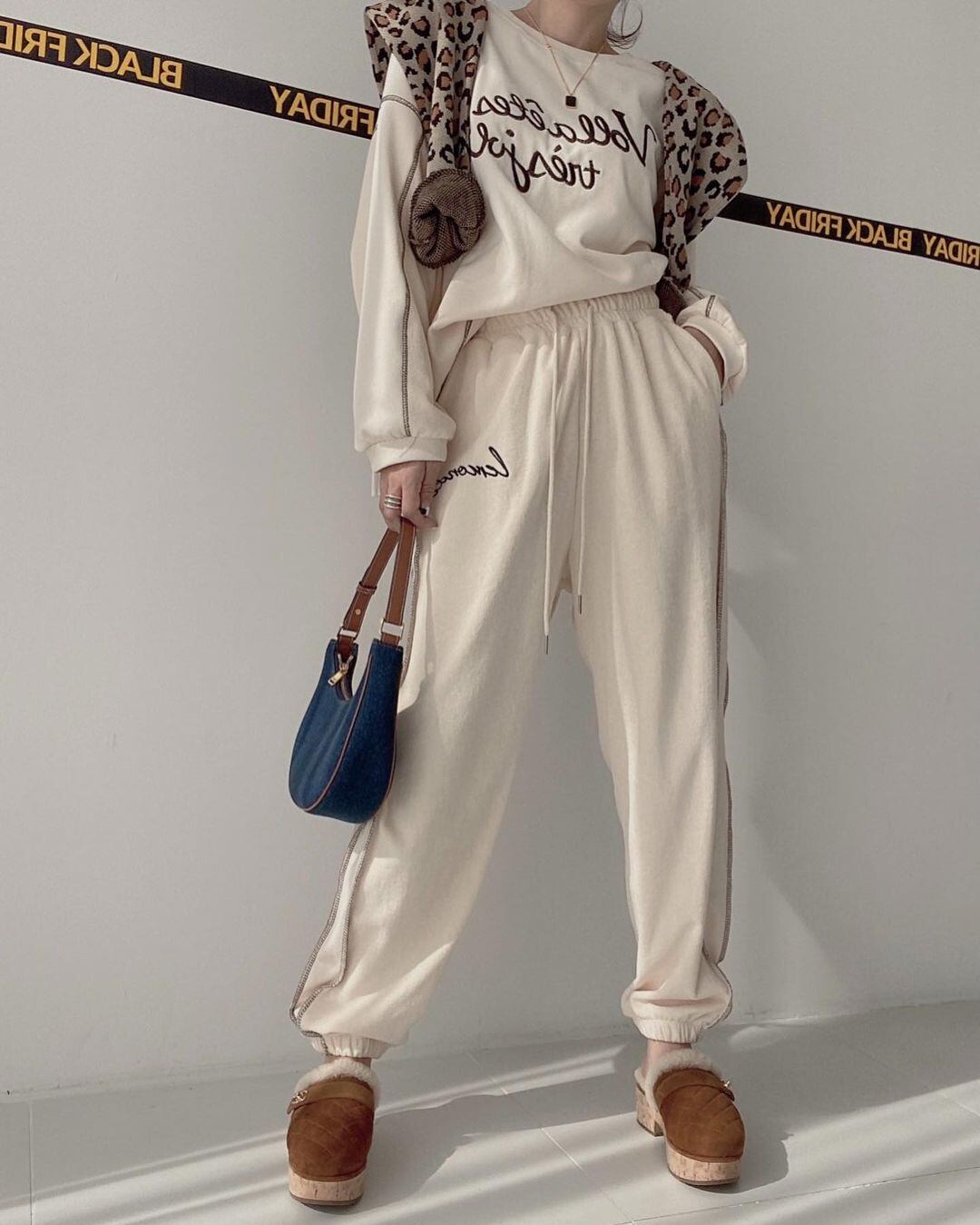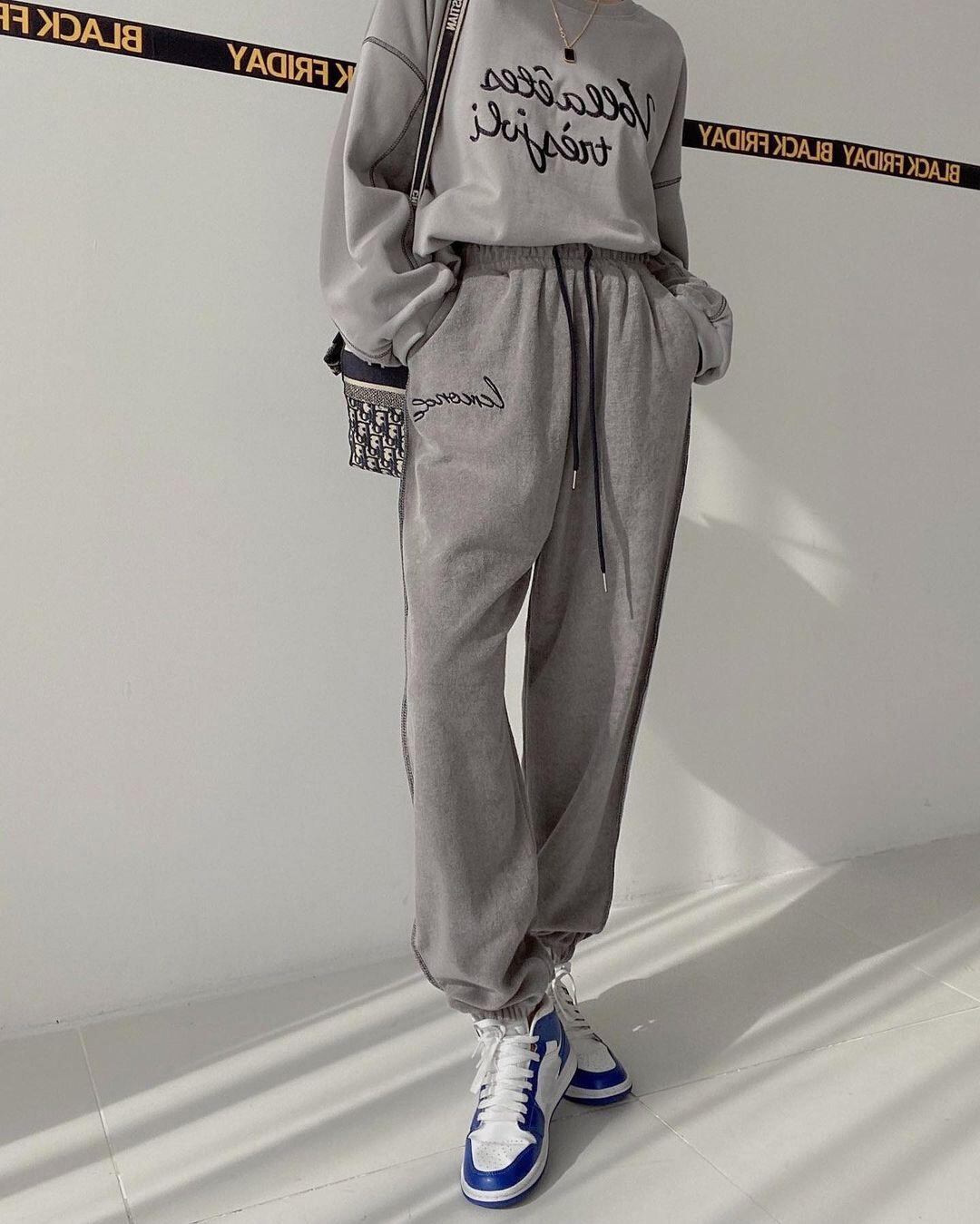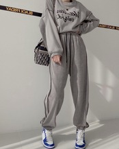 色:黒厚綿T,黒いズボン,グレーの厚手のコットンT,グレーパンツ,ブルースウェットシャツ,青パンツ,アプリコットセーター,アプリコットパンツ