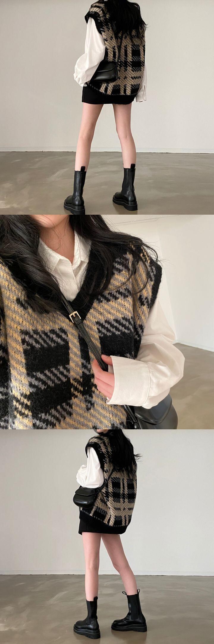 色:白のシャツ,ブラックチェックベスト,グレーチェックベスト,黒スカート