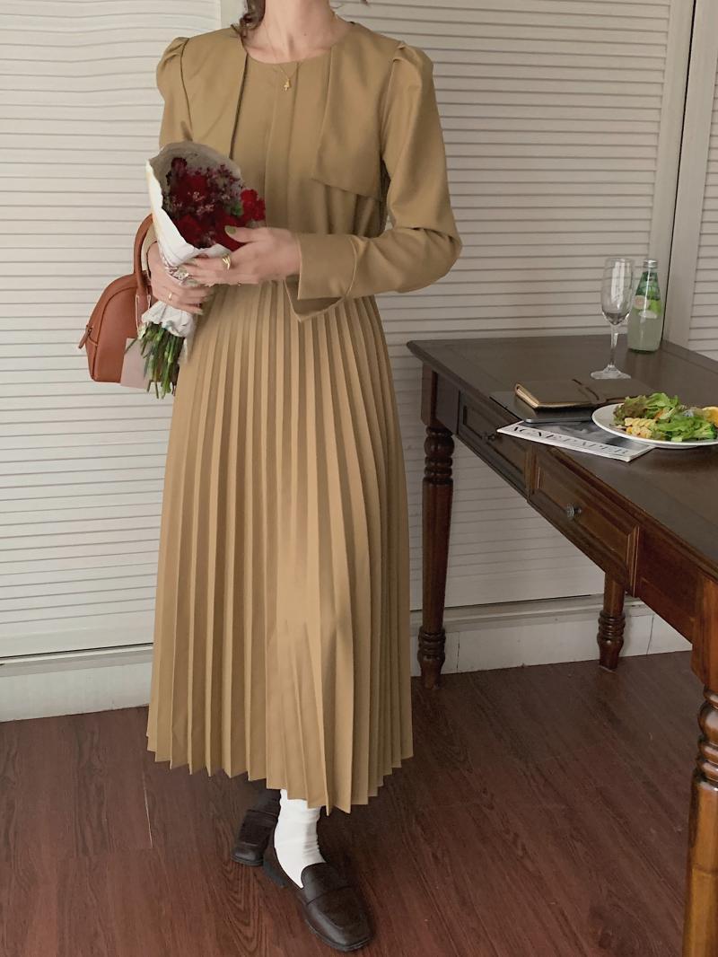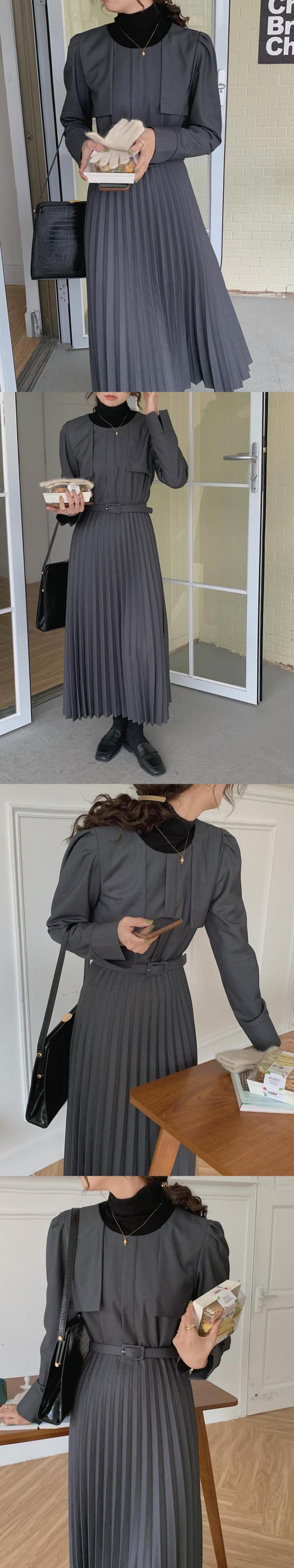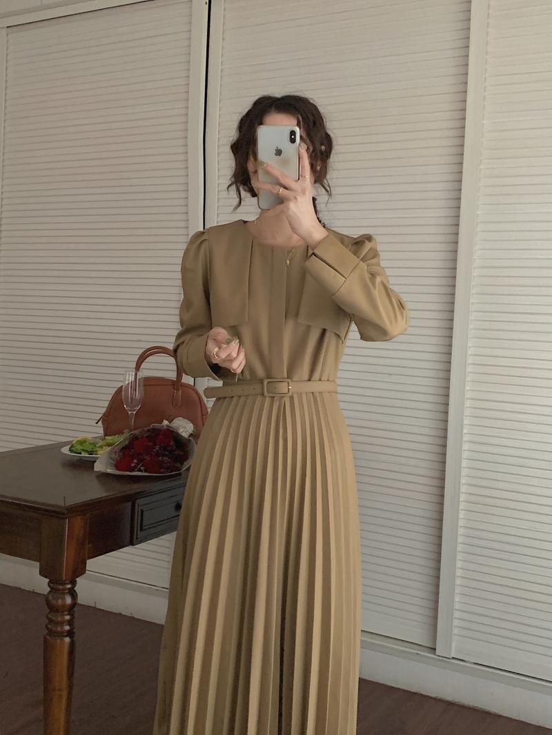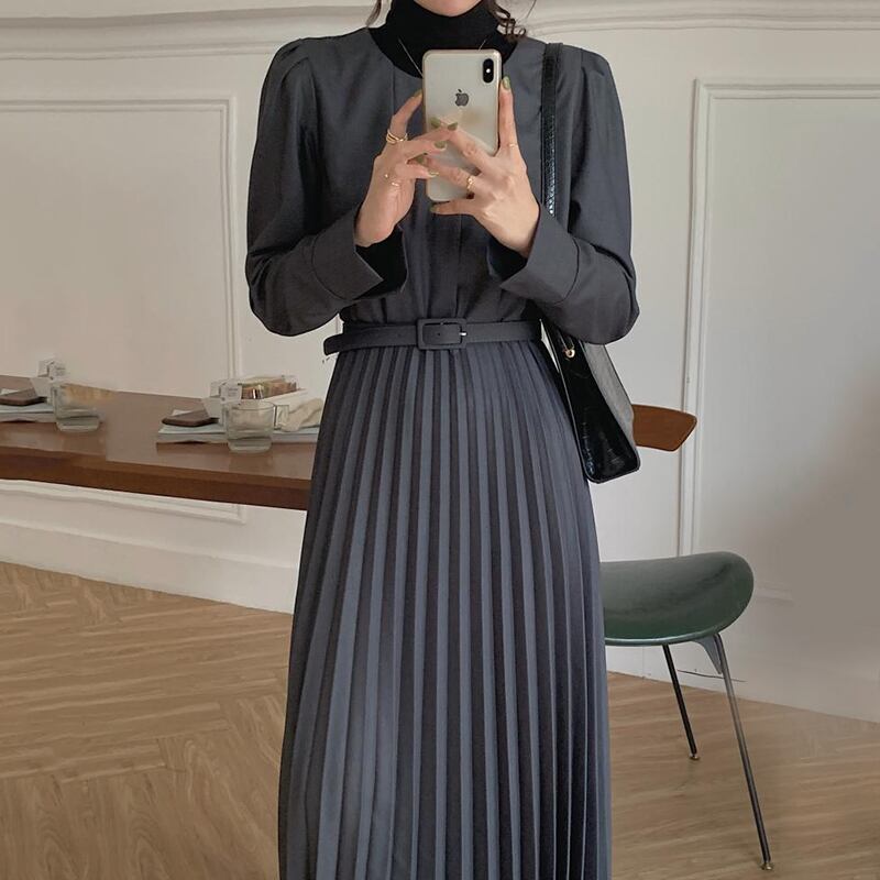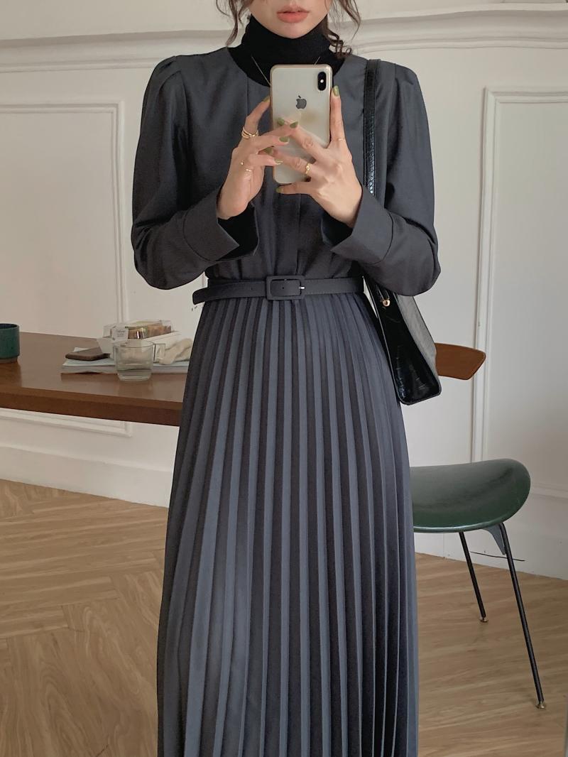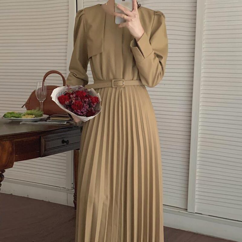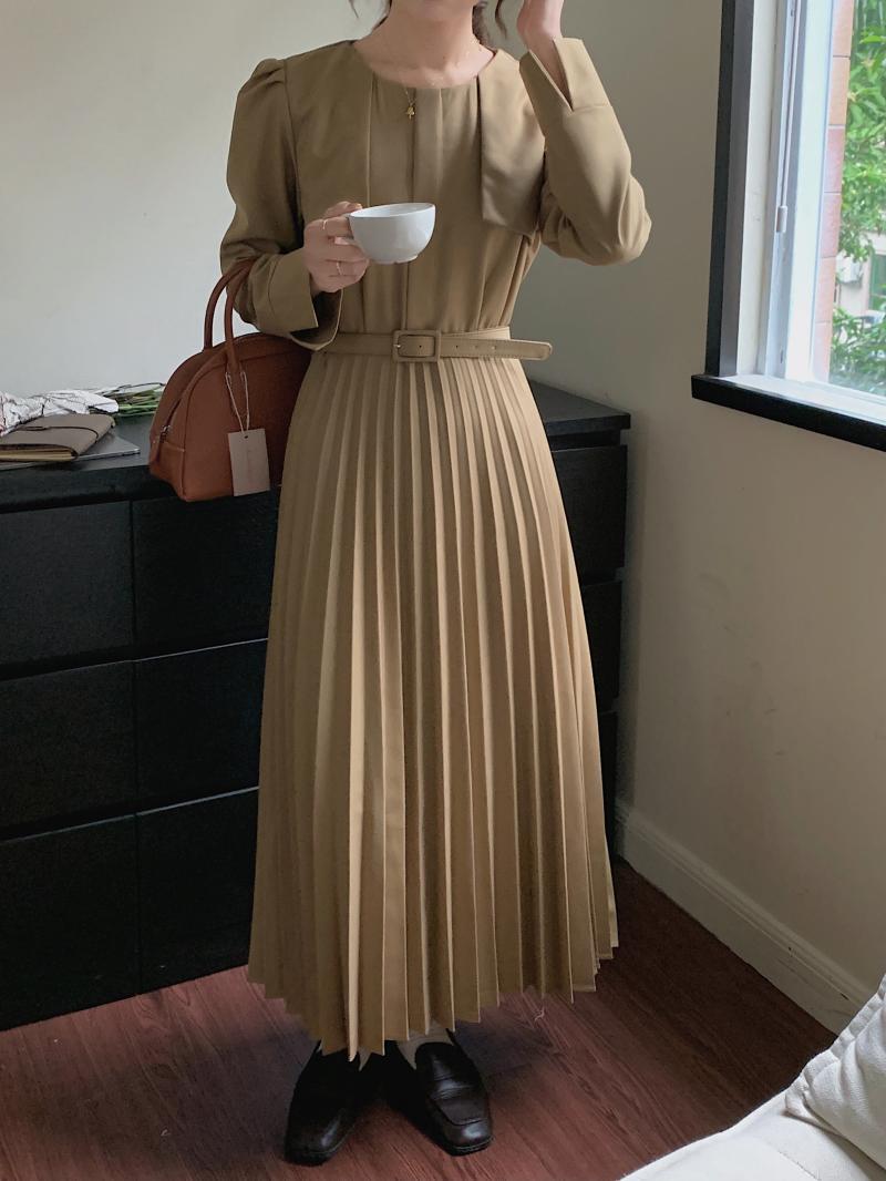 【韓国ファッション】大人可愛い オータムラウンドネックハイウェストウェスト薄手ソリッド カラーロングプリーツドレス ベルト エレガント 秋物 ハーネス Oネック ソリッドカラー ♡ 韓国71931521587 | パリジェンヌ、韓国系ファッション July