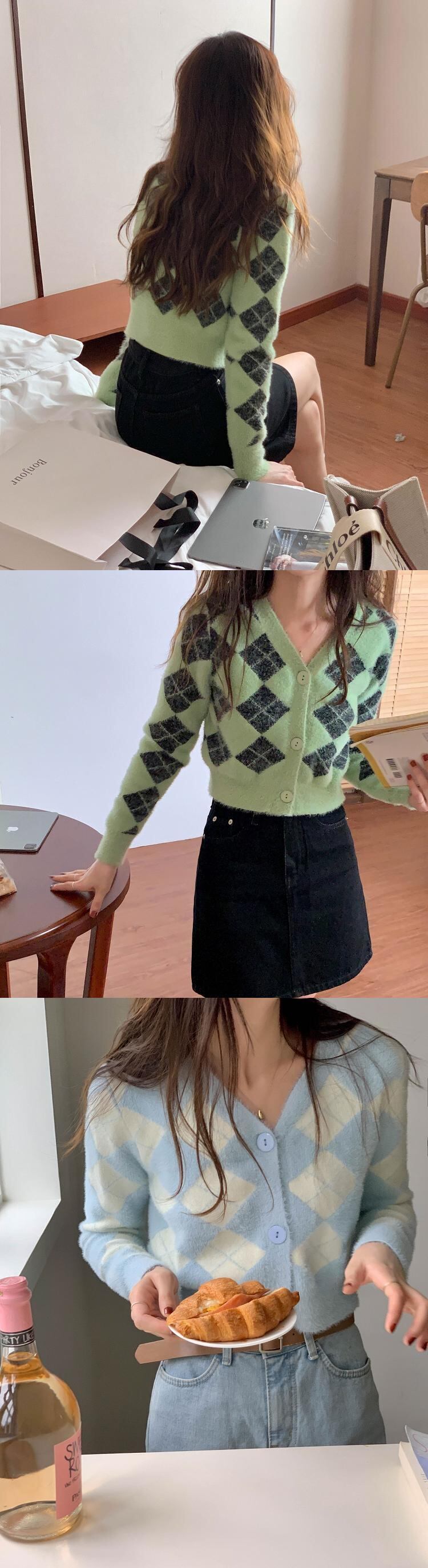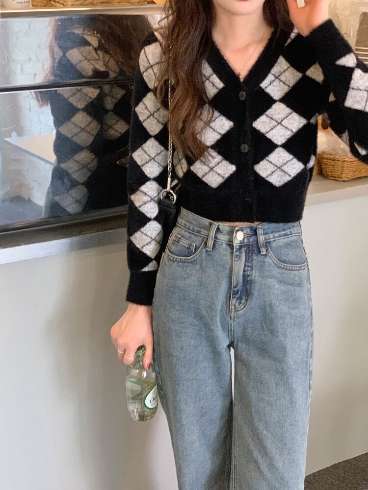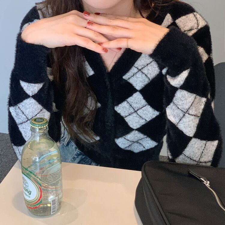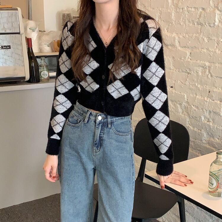 韓国服 スタンダード格子柄ニットカーディガンレディースオータムウィンタースリムセーター ショートVネックジャケット レトロ 秋物 冬物 ♡ nanfeng61146759976 | パリジェンヌ、韓国系ファッション July