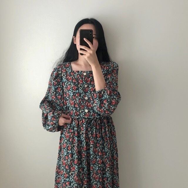 【韓国ファッション】大人可愛い スタンダードフローラルカラープリーツウェストロングスリーブドレス レディース ランタンスリーブ レトロ レース 花柄 レースアップ スクウェア ♡ 韓国96818584289 | パリジェンヌ、韓国系ファッション July